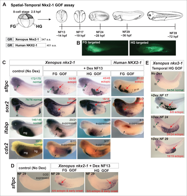 (A) Experimental schematic of Nkx2-1 Gain of function (GOF) assay in Xenopus embryos. 400pg of mRNA encoding GR-fusions of Xenopus Nkx2-1 and Human NKX2-1 was co-injected with 50pg GFP mRNA into dorsal-vegetal (targeting FG) or ventral vegetal blastomeres (targeting HG) blastomeres at the 8-cell stage, and embryos were transferred into culture buffer containing Dexamethasone (Dex) at the indicated stages to induce nuclear Nkx2-1 activity. (B) GFP fluorescence images showing representative FG and HG targeting. (C-E) In situ hybridization analysis of experimental embryos. Representative staining patterns are shown for each condition with the numbers of embryos displaying that pattern listed; numbers are the sum of 4 combined injection experiments. Green arrows indicate normal endogenous expression of the gene assayed, red arrows indicate ectopic expression domains, and black arrows indicate reduced expression. (C) Analysis at NF39 for the indicated genes after Dex induction at NF13: pulmonary specific marker