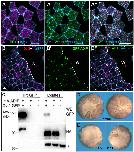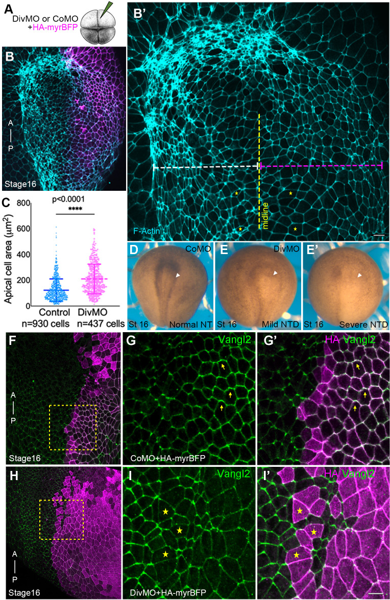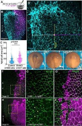 Fig. 1. Diversin depletion impairs apical constriction and leads to planar polarity defects in the neuroectoderm. (A) Experimental scheme. Diversin (Div) morpholino (MO) or control MO (CoMO) was injected with HA-myr-BFP RNA as lineage tracer into a single dorsal blastomere of four-cell Xenopus embryos. (B,C) Diversin depletion inhibits neural plate folding, reduces F-actin and expands the apical domain. (B) Representative stage 16 embryo shows unilaterally expanded neural plate and reduced F-actin intensity in DivMO-injected cells marked by HA-myr-BFP (magenta). (B′) Magnified view of phalloidin-stained cells illustrating the expanded apical domain in DivMO-injected cells (asterisks) on the right side, as indicated by the dashed magenta line. (C) Quantification of the apical domain area; total numbers of cells per group are indicated. ****P<0.0001, Student's t-test. (D-E′) Representative phenotypes of stage 16 embryos unilaterally injected at the four-cell stage with 30 ng of either control morpholino (CoMO) or Diversin MO (DivMO). Arrowheads indicate the injected side. Compared to the normal neural tube closure in CoMO-injected embryos (D), DivMO-injected embryos exhibited a wide range of defects, from mild abnormalities with weak or discontinuous pigmentation (E) to severe neural tube folding defects (E′). (F-I′) Defective Vangl2 polarity in Diversin-depleted embryos. Cells of stage 16 embryo injected with DivMO are marked with HA-myr-BFP (magenta). Anteroposterior (A–P) axis is indicated. (F,H) Vangl2 immunostaining in the magnified regions of CoMO- (F) and DivMO-injected (H) embryos (dashed boxes). (G-G′) Vangl2 is polarized in CoMO-injected cells. (I-I′) Vangl2 polarity is reduced in DivMO-injected cells (asterisks). Anti-HA staining for HA-myr-BFP (F,G′,H,I′), and anti-Vangl2 staining (G,I) are shown. HA-myr-BFP staining is variable for F and H, due to distinct locations of the injection sites. Scale bars: 20 μm. Data represent six embryos from three independent experiments. |
