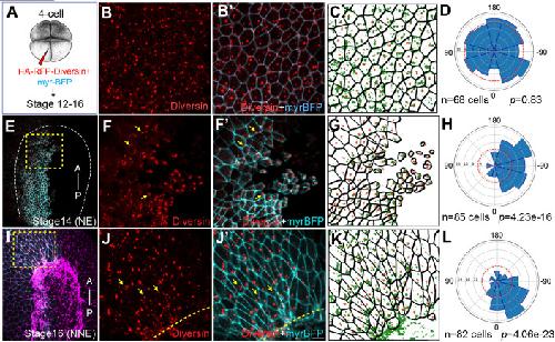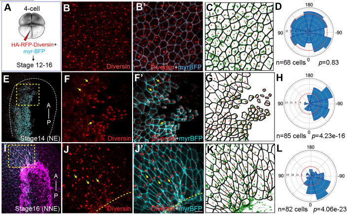 Fig. 2. Planar polarization of Diversin in ectoderm cells during neurulation. (A) Schematic of RNA injection: HA-RFP-Diversin RNA (200 pg) was co-injected with myr-BFP RNA (50 pg) as cell border and lineage tracer into four-cell embryos to target neural or non-neural ectoderm. (B-D) Animal pole ectoderm at stage 12. (E-H) Anterior neural plate at stages 14. (I-L) Nonneural ectoderm adjacent to anterior neural plate border. Yellow arrows indicate Diversin accumulation at cell corners. Dashed boxes highlight regions with polarized Diversin that are magnified in F and J. Neural plate border is marked by dashed lines or intense F-actin staining (magenta in I). Anterior–posterior axis is shown in (E,I). NE and NNE, neural and non-neural ectoderm, respectively. Scale bar: 20 µm. (C,G,K) Cell segmentation. Red arrows indicate cell polarity marked by Diversin puncta enrichment. Rose plots (D,H,L) show Diversin puncta enrichment relative to the posterior axis (0° in H), neural plate midline (H), or anterior neural plate border (L). Data are from three embryos. Chi-square tests indicate non-random Diversin distribution. |