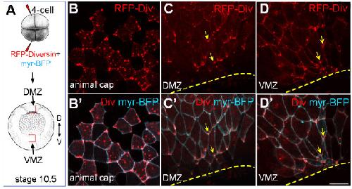 Fig. 3. Diversin polarizes in the cells adjacent to the blastopore lip during gastrulation. (A) Schematic of RNA injections. RFP-Diversin (200 pg) and myr-BFP (50 pg) mRNAs were co-injected into the animal pole or the marginal zone of Xenopus four-cell embryos. (B) Animal view of early gastrula, (C-D′) vegetal view of stage 10.5 gastrula with red dashed boxes corresponding to the dorsal and ventral marginal zones (DMZ and VMZ) at the blastopore lip. (B-D″) RFP-Diversin localization in animal ectodermal cells (B,B′), or cells adjacent to the DMZ (C,C′) and VMZ (D,D′) blastopore lip at stage 10.5. Yellow arrows indicate asymmetric Diversin accumulation at cell corners. Scale bar: 50 μm. Data represent five to ten embryos per group. |