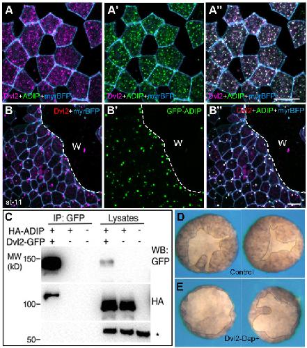 Fig. 6. Polarization of the Dvl and ADIP complex during epidermal wound healing. (A-A″) Colocalization of RFP-Dvl2 (A) and GFP-ADIP (A′) in the control unwounded stage 11 Xenopus ectoderm. (B-B″) Dvl2 (B) and ADIP (B′) puncta polarize relative to the wound edge. Scale bars: 20 µm. Cell borders are outlined by myrBFP. Data are representative of two independent experiments. (C) Physical association of Dvl2-GFP and HARFP-ADIP revealed by the pulldown with GFP-trap. Non-specific band (asterisk) demonstrates equal protein loading. Molecular weight markers (kD) are indicated on the left. (D,E) Inhibition of epidermal wound healing by the dominant-interfering Dvl2 construct. Ectoderm explants were isolated from stage 9.5 embryos injected earlier with Dvl-DEP+ RNA (1 ng, E) or control embryos (D). Wound healing was assessed after 1 h post wounding as the area of the epidermis covering the wound (marked by the dotted line). Data are representative of three experiments with 58 explants in each group. |