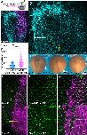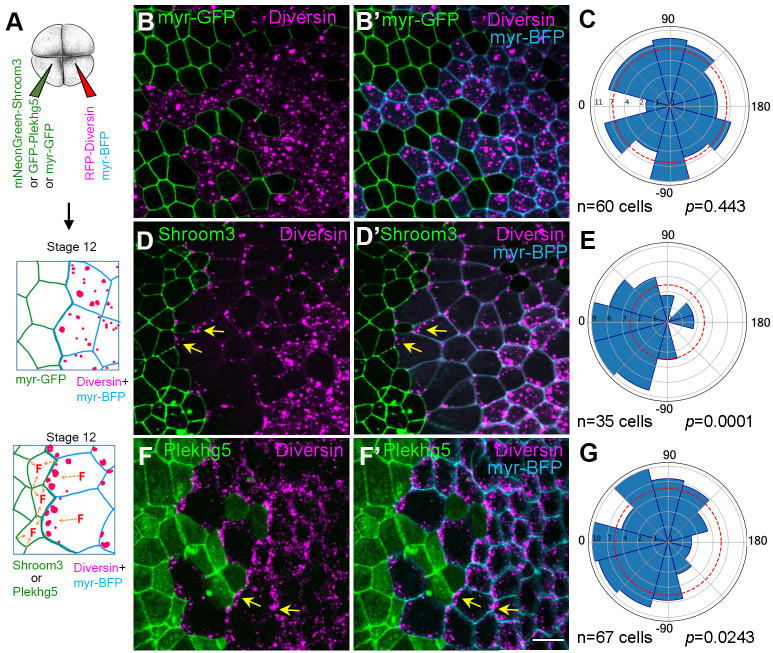 Fig. 4. Diversin puncta orient towards apically constricting neighboring cells. (A) Experimental scheme. Clones expressing control myr-GFP (20 pg), mNeonGreen-Shroom3 (20 pg), or GFP-Plekhg5 (20 pg) mRNA. RFP-Diversin-expressing cells are marked with myr-BFP (cyan). (B-B″,D-D″,F,F′) Random distribution of RFP-Diversin (red) in cells adjacent to control mem-GFP clones at stage 12.5. (B,B′) Polarized accumulation of RFP-Diversin toward neighboring mNeonGreen-Shroom3 (D,D′), and GFP-Plekhg5 (F,F′) expressing cells. Yellow arrows show the enrichment of Diversin puncta. Scale bar: 20 µm. (C,E,G) Rose plots show Diversin puncta orientation relative to the border of adjacent control cells (C), mNeonGreen-Shroom3-expressing cells (E) and GFP-Plekhg5-expressing cells (G), respectively. (0° is perpendicular to the border). Data represent three embryos per condition. Chi–square analysis confirms random distribution in controls (B-B″,C) but not in the cells adjacent to Shroom3 (D-D″,E) or Plekhg5-expressing cells (F-F″,G), respectively. |