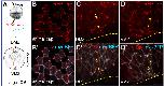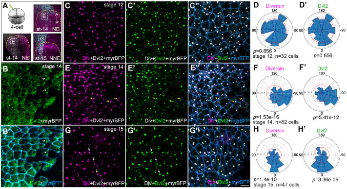 Fig. 5. Diversin colocalizes with Dvl2 in neural and epidermal ectoderm. (A) Injection scheme. GFP-Dvl2 (200 pg) together with myr-BFP (50 pg) or RFP-Diversin (200 pg), GFP-Dvl2 (200 pg) with myr-BFP (50 pg) mRNAs were co-injected as indicated into one dorsal blastomere of four-cell stage Xenopus embryos. Myr-BFP marks cell borders. Neural plate border is outlined by yellow dashed lines, Phalloidin staining is shown (magenta), and the anterior–posterior (A–P) axis is indicated. White boxes mark stage 14 anterior neural ectoderm (NE) in (B-B′) and (E-E″) or adjacent stage 15 non-neural ectoderm (NNE) in (G-G′′). (B,B′) Stage 14 anterior neural ectoderm, dorsal view. GFP-Dvl2 (B); merged with myr-BFP (B′). GFP-Dvl2 puncta weakly oriented in few cells relative to midline of the neural plate. (C-D′) Stage 12 ectoderm. RFP-Diversin (C); GFP-Dvl2 (C′); merged with myr-BFP (C′′). Rose plots show random orientation of Diversin (D) and Dvl2 (D′). (E-F′) Stage 14 anterior neural ectoderm embryo show the localization of RFP-Diversin (E), GFP-Dvl2 (E′); merged with myr-BFP (E′′). Rose plots show orientation of Diversin (F) and Dvl2 (F′) to the midline of neural plate. (G-H′) Stage 15 anterior non-neural ectoderm, dorsal view. RFP-Diversin (G), GFP-Dvl2 (G′); merged with myr-BFP in G′′. White arrows show the orientation of Diversin and Dvl2. Scale bar: 20 µm. (E-G′), Rose plots show Diversin (H) and Dvl2 puncta (H′) polarization in tissue plane, 0° corresponds to the posterior axis. Quantification is based on three independent embryos. Chi-squire test shows non-random distribution of Diversin and Dvl2 puncta. |
