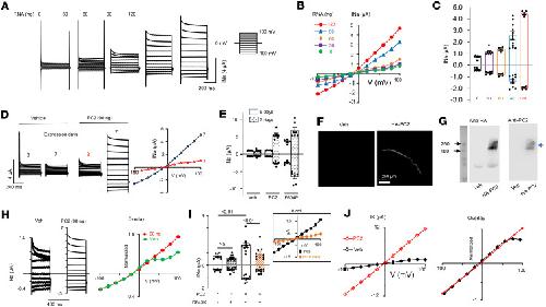 Figure 1. WT PC2 expresses currents in Xenopus oocytes.(A) Currents in Xenopus oocytes injected with vehicle (water), or mRNA coding for WT PC2. Currents were recorded by 2-electrode voltage-clamp in a bath solution with 100 mM NaCl. Holding potential was –50 mV, and 400 ms steps were applied from –100 mV to 100 mV in 20 mV increments. (B) Steady-state (at 400 ms) current-voltage (I-V) relationship curves from A. (C) Mean ± SEM for inward and outward currents at –100 and 100 mV. n = 8, 7, 4, 10, 4 for 30, 60, 90 and 120 ng mRNA injection, P <0.0001, 1-way ANOVA. (D) Step currents and steady-state I-V from oocytes recorded 3 or 7 days after injection. (E) Mean ± SEM for inward and outward currents from oocytes recorded at 5 or 7 days. P <0.01, 7 days versus 5 days for PC2 (90 ng) or F604P (30 ng mRNA injected); P < 0.001 for PC2 (n = 5) versus F604P (n = 5) at 5 days; P < 0.01 for PC2 (n = 9) versus F604P (n = 7) at 7 days. n = 5 and 7 (5- and 7-day) for vehicle injected group. (F) Immunofluorescence staining using antibody against HA tag. Scale bar: 150 μm. (G) Western blot of oocyte lysates probed by anti-PC2 or anti-HA antibody. Oocytes were injected with vehicle or C-terminal HA-tagged PC2 in F and G. Blue arrow: HA-tagged PC2; black arrow: 250 and 100 kDa protein standards. (H) Oocytes were injected with vehicle or PC2 mRNA. I-V curve of steady-state current at 400 ms were scaled and overlaid. (I) Oocytes were injected with vehicle or WT PC2 and with or without D643K PC2 mutant at 1:1 mRNA ratio. Inset showed I-V relationship, n = 10 for all. (J) Currents were recorded in a bath solution containing 100 mM KCl. Scaled and overlaid currents. Two-tailed unpaired Student’s t test for E and I. |