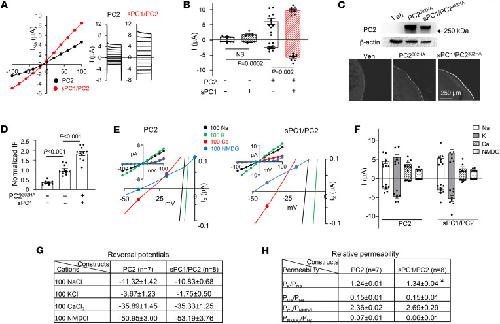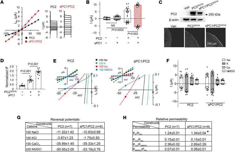 Figure 2. PC1 increases surface expression and K+ permeability of PC2.(A) I-V relationship of currents from oocytes expressing PC2 alone or sPC1/PC2 recorded in100 mM NaCl. (B) Mean ± SEM for inward and outward currents at –100 and 100 mV in oocytes injected with vehicle or mRNA for PC2, sPC1 or both; n = 10, 5, 8, and 8, respectively. (C) Oocytes injected with vehicle or mRNA for a HA-tagged PC2 (PC2302HA), with or without sPC1. PC2302HA contains an extracellular HA tag engineered to replace amino acids 302–306 of the TOP domain (second extracellular loop) of PC2. Top: representative Western blot of total oocyte lysates probed with anti-PC2 and anti–β actin antibody. Bottom: representative immunofluorescence (IF) staining images using anti-HA antibody extracellularly in nonpermeabilized oocytes. IF staining in oocytes injected with sPC1 alone was not different from vehicle-injected (not shown). (D) Mean ± SEM of normalized IF intensity of surface expression of PC2302HA in control (vehicle), PC2302HA, and sPC1/ PC2302HA-injected oocytes as in C (n = 9, 11, and 11, respectively). IF intensity was normalized to PC2302HA-injected oocytes. (E–H) Oocytes expressing PC2 or sPC1/PC2 were recorded in 100 mM NaCl, KCl, CaCl2, or NMDGCl. (E) Representative I-V with enlarged curves showing reversal potentials. (F) Mean ± SEM for inward and outward currents at –100 and 100 mV, n = 7 and 8 for PC2 and sPC1/PC2. (G) Reversal potentials. (H) Calculated relative permeability PX/PY. *P < 0.01 for PC2 versus sPC1/PC2. Two-tailed unpaired Student’s t test for B and D–F. In all panels, experimental number (n) is number of oocytes as shown by scatter plots. All experiments were repeated 2 or more times with similar results. |