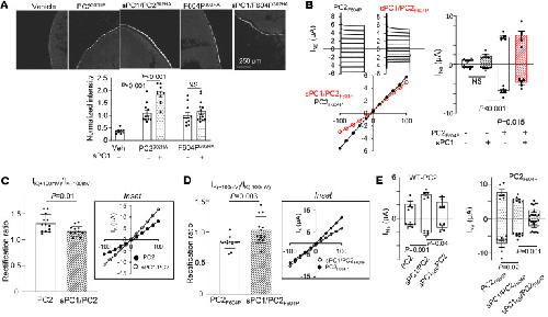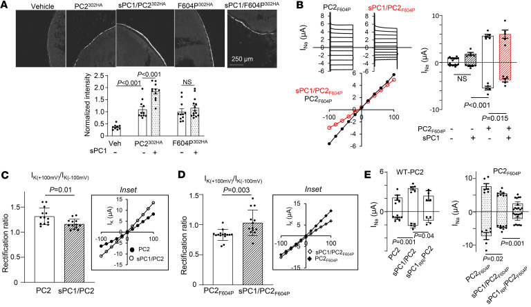 Figure 3. GOF mutation F604P-PC2 mutant is different from WT PC2.(A) Representative immunofluorescence (IF) images and mean ± SEM of normalized IF intensity of surface expression of PC2F604P (labeled F604P302HA, n = 11) or F604P302HA/sPC1 (n = 14) as indicated. IF staining using anti-HA antibody against HA tag on the TOP domain as in Figure 2C. Note that the experiments in A were conducted concurrently with those shown in Figure 2, C and D; thus, the intensity of the IF images were comparable. Scale bar: 150 μm. (B) Representative current steps, steady-state I-V curve (at 400 ms), and mean ± SEM for inward and outward currents at –100 and 100 mV in oocytes injected with mRNA for F604P-PC2 (PC2F604P) or PC2F604P/sPC1 as indicated. n = 5 for each group. Experiments were conducted concurrently with those shown in Figure 2B; refer to Figure 2B for the values of the vehicle and sPC1-injected groups. (C) Rectification ratio of PC2 and sPC1/PC2 currents recorded in 100 mM KCl bath. The ratio of outward K+ current (at +100 mV) to inward K+ current (at –100 mV) is shown. n = 13 each group. Inset: I-V curve. (D) Rectification ratio for PC2F604P and sPC1/PC2F604P as illustrated in C. n = 13 each group, inset: I-V curve. (E) Effect of sPC1 carrying R4100E and R4107E mutation (sPC1RR) on inward and outward currents of heteromeric channels formed with PC2 and PC2F604P. n = 4–5 each group. Two-tailed unpaired Student’s t test for A–E. In all panels, experimental number (n) is number of oocytes as shown by scatter plots. All experiments were repeated 2 or more times with similar results. |