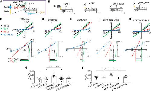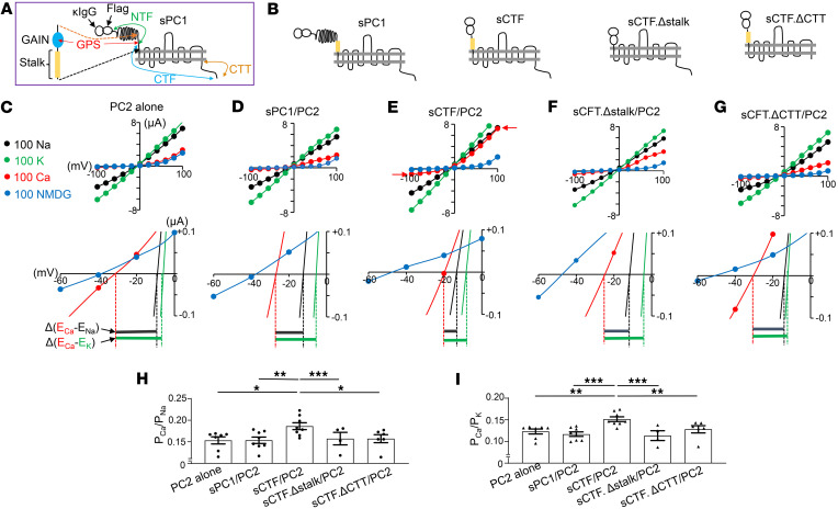 Figure 4. Removal of N-terminus of PC1 at GPS site increases Ca2+ permeability of the heterotetramer.(A) Schematic illustration of the sPC1. κIgG: κ IgG light chain signal peptide; Flag, Flag antibody epitope tag; NTF, N-terminal fragment; CTF, C-terminal fragment; CTT, intracellular C-terminal tail. Cleavage at GPS site (G-protein coupled-receptor domain proteolytic site) results in NTF and CTF. NTF contains multiple adhesion domains for protein and carbohydrate interaction and a partial GAIN domain sequence before GPS. CTF contains stalk peptide region, 11 transmembrane domains, and the C-terminal tail (CTT). The enlarged region shows GAIN domain (GPCR auto-proteolysis inducing, blue) that contains GPS and stalk peptide (yellow). Full-length PC1 is 4,303 amino acids; NTF is 3,048 amino acids; CTF is 1,255 amino acids; CTT is ~186 amino acids. Not drawn to scale. (B) Scheme of sPC1 deletion constructions used. (C–G) Representative I-V curves for PC2 alone or with different sPC1 deletion constructs recorded in bath solution containing (in mM) 100 NaCl (black), 100 KCl (green), 100 CaCl2 (red), or 100 NMDG-Cl (blue). Selected regions of I-V curves are enlarged to show reversal potentials. Reversal potential shifts from CaCl2 to NaCl [labeled Δ(ECa-ENa)] and to KCl [Δ(ECa-EK)] are shown. In E, red arrows indicate that Ca2+ entry through heteromers leads to increased inward current size and show that Ca2+-activated Cl– current contributes to increases in outward current size (E versus other panels). TMEM16A channel inhibitor, T16A(inh)-A01 (10 μM), does not cause complete inhibition of endogenous Ca2+-activated Cl– currents. (H and I) The relative permeability of Ca2+ versus Na+ (PCa/PNa) and Ca2+ versus K+ (PCa/PK) were calculated from potential shifts upon switching extracellular solution. Individual n numbers for each group are shown in Supplemental Table 1. *P < 0.001, **P < 0.002, ***P < 0.01, by 2-tailed unpaired Student’s t test. |