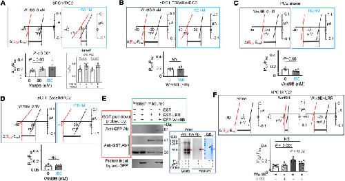 Figure 6. Purified Wnt9B protein increases Ca2+ permeability of heteromeric sPC1/PC2 channel.(A–D) Oocytes expressing sPC1/PC2 (n = 8, 7, and 5 for 0, 50, and 150 nM Wnt9B, respectively) (A), sPC1.T3049V/PC2 (n = 6 and 8 for 0 and 150 nM Wnt9B, respectively) (B), PC2 alone (n = 4 and 7 for 0 and 150 nM Wnt9B, respectively) (C), or sCFT.Δstalk/PC2 (n = 6 and 7 for 0 and 150 nM Wnt9B, respectively) (D) were incubated overnight with either vehicle or purified Wnt9B (50 or 150 nM). PCa/PNa was calculated based on reversal potential shift between 100 mM CaCl2 and 100 mM NaCl. Inset in A shows that sPC1 with or without Flag-tag (plus PC2) responded to Wnt9B. (E) Biochemical interaction between PC1 leucine-rich repeat (LRR) and Wnt9B. Mixtures containing purified GFP-Wnt9B, GST-LRR, or GST alone were subjected to pull-down using GST-sepharose beads. Pull-down samples were probed with anti-GFP or anti-GST antibodies. Protein input samples were probed by anti-GFP Ab. Note that purified GST-LRR fusion proteins also contained some cleaved GST alone. Inset shows a ~51 kDa HA-tagged NTF fragment is released into the medium in the presence of Wnt9B. Control or oocytes expressing sPC1/PC2 were incubated with or without Wnt9B (300 nM) overnight. sPC1 contains an N-terminal HA-tag immediately after the κIgG signal peptide. The medium was concentrated 10-fold for Western blot analysis by anti-HA antibody. Proteins in the medium were also stained by Coomassie blue (CB). Red and black asterisks indicate HA-tagged NTF fragment and GST-Wnt9B, respectively. Experiment was repeated 3 times. (F) Oocytes expressing sPC1/PC2 were incubated overnight with vehicle or purified Wnt9B (150 nM), with or without LRR (1,500 nM). PCa/PNa was determined as in A–D. Data are shown as mean ± SEM. n = 8, 5, 6, and 6 for no treatment, LRR, Wnt9B, and LRR+Wnt9B treated groups, respectively. Two-tailed unpaired Student’s t test for A–D and F. |