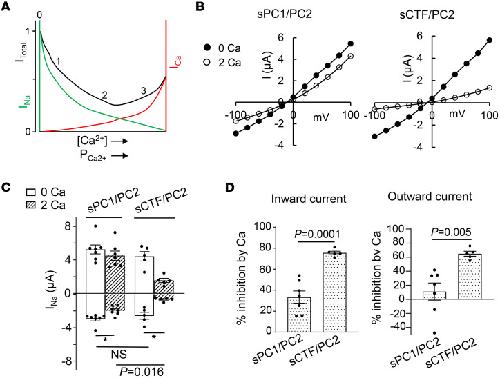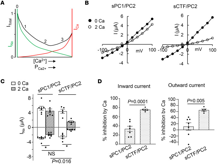 Figure 7. PC1 N-terminal cleavage enhances extracellular Ca2+ inhibition of Na+ current through heteromeric sPC1/PC2 channels.(A) Illustration of anomalous mole fraction effect. Total current (black trace, ITotal) is the sum of Na+ current (green, INa) and Ca2+ current (red, ICa). (B) Representative I-V curve of currents in oocytes expressing sPC1/PC2 or sCTF/PC2 in 100 mM NaCl bath with 0 or 2 mM external Ca2+. (C) Mean ± SEM of inward and outward currents at –100 and 100 mV for experiments shown in B. n = 5–8 for each group as shown by scattered plots. *P < 0.05. (D) Percentage inhibition of inward and outward currents by 2 mM external Ca2+ from experiments in C. Two-tailed unpaired Student’s t test for C and D. All experiments were repeated 2 or more times with similar results. |
