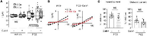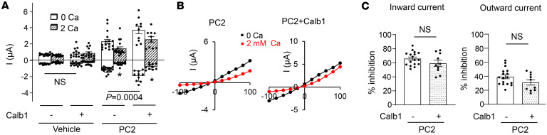 Figure 8. Effect of calbindin-1 (Calb1) on PC2 current and external Ca2+-induced current inhibition.(A) Currents in oocytes injected with vehicle or PC2 mRNA, with or without Calb1. Currents were recorded in 100 mM NaCl bath with 0 or 2 mM external Ca2+. Mean ± SEM of inward and outward currents at –100 and 100 mV are shown. n = 11–17 for each group as shown by scattered plots. (B) Representative I-V curves for experiments in A. (C) Percentage inhibition of inward and outward currents by 2 mM external Ca2+ in PC2 with or without Calb1 from experiments in A. Two-tailed unpaired Student’s t test for A and C. All experiments were repeated 2 or more times with similar results. |