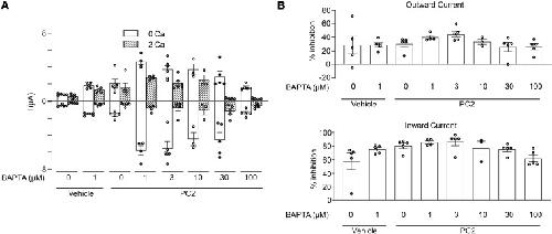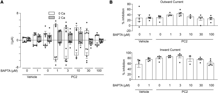 Figure 9. Effect of BAPTA-AM on PC2 current and external Ca2+-induced current inhibition.(A) Oocytes injected with vehicle or PC2 mRNA were incubated with BAPTA-AM at the indicated concentration for 2 hours before recording currents in 100 mM NaCl bath solution with 0 or 2 mM external Ca2+. Mean ± SEM of inward and outward currents at –100 and 100 mV are shown. n = 3–5 for each group as shown by scattered plots. P = 0.0002 by 1-way ANOVA. (B) Percentage inhibition of inward and outward currents by 2 mM external Ca2+ in vehicle or PC2-injected oocytes at indicated BAPTA-AM concentration. P = 0.09 by 1-way ANOVA for both, not statistically different for inhibition of either inward or outward current. All experiments were repeated 2 or more times with similar results. |