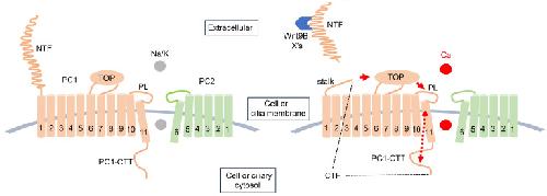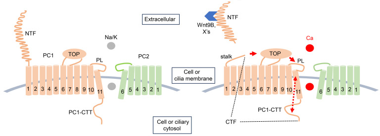Figure 10. Working model for Wnt9B action of heteromeric PC1/PC2 channel.PC1 contains 11 transmembrane (TM) domains, while PC2 has 6. The last 6 TMs of PC1, together with PC2, form heteromeric channels. Autocleavage of PC1 at GPS site produces NTF and CTF (right panel; the region CTF is marked by dotted lines). The cleaved NTF remains noncovalently attached to the heteromeric CTF/PC2 channels. The complexes exist on cell or ciliary membrane. Normally, PC1/PC2 heteromers preferentially conduct monovalent cations K+ and Na+ over Ca2+. Secreted Wnt9B and other unidentified potential ligands (labeled X) bind to the complex extracellularly facilitating the release of NTF. This process exposes the hidden stalk peptide, which act as a tethered agonist to increase the Ca2+ permeability of heteromers. How stalk peptide does this remains unknown, it may involve interaction with the TOP domain, which in turn interacts with the pore loop (PL) of PC1 (depicted by red arrows), as suggested recently by Pawnikar et al. (26, 27). Notably, the C-terminal tail of PC1 (PC1-CTT), located immediately downstream of the pore, likely influence ion permeation (depicted by arrowed red broken line). Only the TOP domain of PC1 is illustrated in the model. Shear stress may promote detachment of the noncovalently bound NTF under certain conditions (48), though this is not sufficient by itself in our experimental setting, where oocytes were subject to continuous shaking on a platform shaker for 7 days after mRNA injection. |