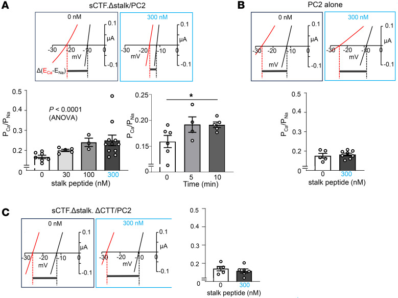 Figure 5. External application of stalk peptide increases Ca2+ permeability of heteromeric channel formed by PC2 and stalkless sCTF.(A) Top: oocytes expressing sCTF.Δstalk/PC2 were incubated with synthetic stalk peptide at 0, 30, 100, or 300 nM for 4 hours. The 21–amino acid peptide corresponds to residues 3049-TAFGASLFVPPSHVRFVFPEP-3069 of human PC1. Bottom left: PCa/PNa was calculated based on reversal potential shift between 100 mM CaCl2 and 100 mM NaCl. Data are shown as mean ± SEM. P < 0.0001 by 1-way ANOVA.; n = 7, 5, 3, and 12 for 0, 30, 100, and 300 nM, respectively, of stalk. Bottom right: time course of stalk peptide (300 nM) on increases in PCa/PNa. (B and C) No effect of stalk peptide (300 nM) on PC2 alone (n = 5 and 8 for 0 and 300 nM peptide) (B) or sCTF.Δstalk.ΔCTT/PC2 (n = 5 and 6 for 0 and 300 nM peptide) (C). Two-tailed unpaired Student’s t test for B and C. In all panels, experimental number (n) is number of oocytes as shown by scatter plots. All experiments were repeated 2 or more times with similar results. |