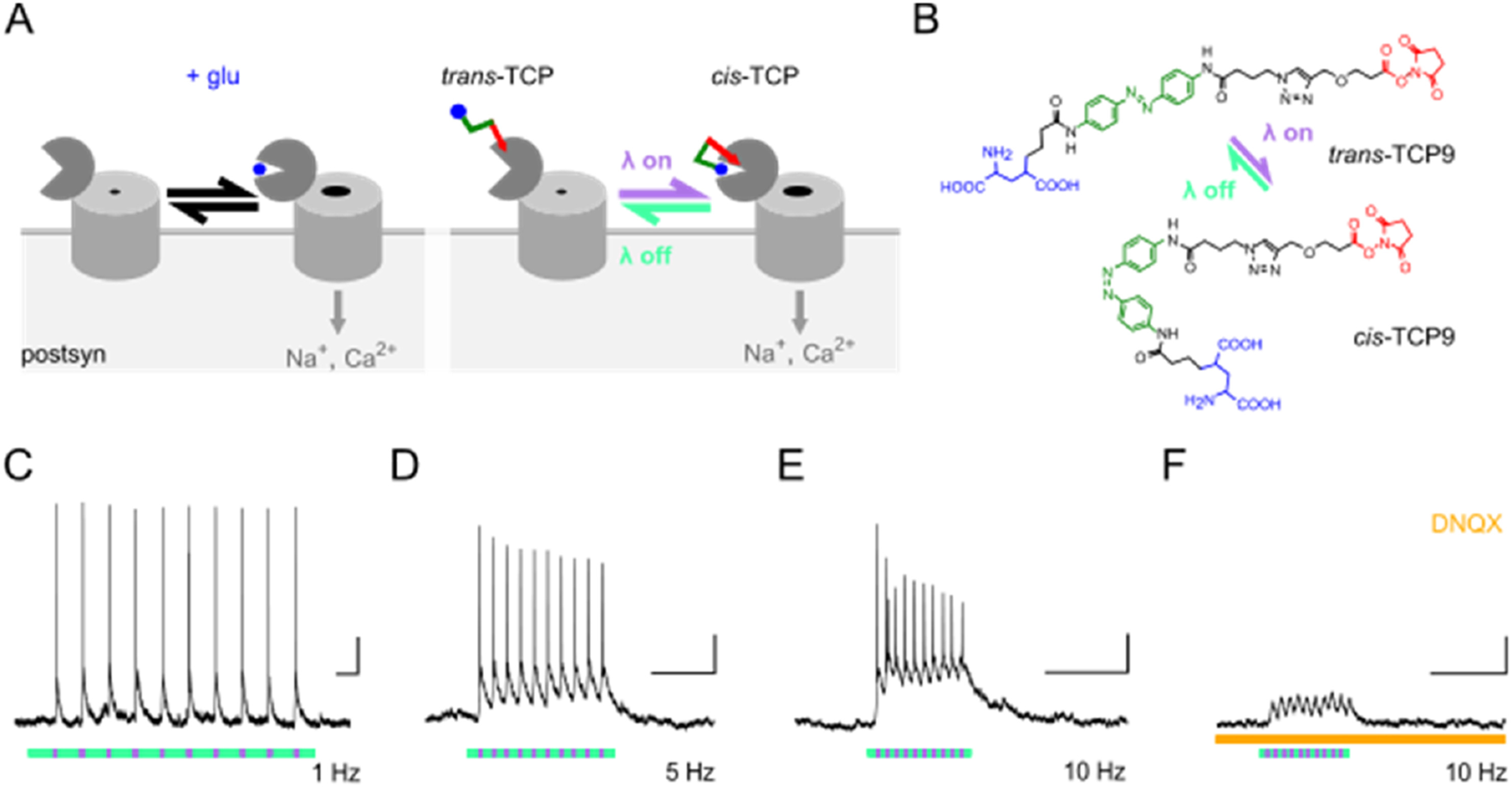 Figure 1 Reversible photocontrol of neuronal firing rate in 2D dissociated hippocampal cell cultures using a targeted covalent photoswitch (TCP) of endogenous glutamate receptors. a) Operational mode of TCP9 on GluRs (Izquierdo-Serra et al., 2016). In physiological conditions (left), glutamate secreted by presynaptic terminals binds to the extracellular ligand binding domain (LBD) of GluRs at the postsynaptic membrane and opens their cation-permeable channel. The TCP9 photoswitchable tethered agonist exerts an equivalent effect on GluRs (right). The glutamate moiety (blue dot) is tethered to the LBD through a reactive NHS ester group (red line) via a reversibly photoswitchable azobenzene group (green line). In the trans state of the switch, glutamate cannot reach the ligand binding pocket, whereas in the cis state, the glutamate moiety can bind and activate the receptor, opening the channel pore and depolarizing the postsynaptic terminal. Switching between cis and trans states is achieved by illumination with violet and green light, respectively. b) TCP9 chemical structure showing the photoisomerization between the trans configuration (promoted by green light, = 430-550 nm, or thermal relaxation in the dark) and the cis configuration (promoted by violet light, = 360-410 nm). c-f) Representative current clamp recordings from a rat hippocampal neuron (membrane potential set at -70 mV) after 11 days in culture, treated with 12.4 M TCP9 for 2 min at pH 9, washed, and exposed to alternating 500 nm (green rectangles) and 380 nm (violet rectangles) light pulses. Violet light pulses of 40 ms and 0.8 mWcm-2 were delivered at 1 Hz (c), 5 Hz (d) and 10 Hz (e) in the same neuron. (f) Photoresponses in this neuron are inhibited in the presence of 1 mM DNQX (AMPAR/KAR antagonist, orange bar). Scale bars represent 10 mV, 1 s. Quantification of the photostimulation parameters of panels c-f across different neurons and pulse durations is shown in Fig. S1.