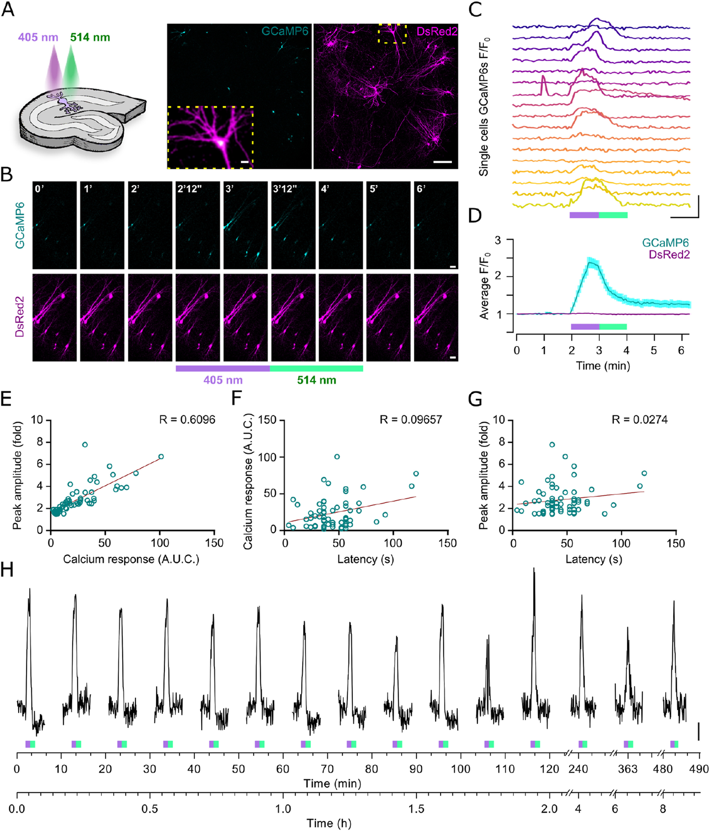 Figure 2 TCP9 permits the long-term reversible photocontrol of neuronal activity in 3D organotypic hippocampal slices mediated by endogenous GluRs. a) Schematic drawing of a rat organotypic hippocampal slice culture, and microphotographs of a slice expressing GCaMP6s (cyan) and DsRed2 (magenta). Inset image corresponds to the GCaMP6 and DsRed2 superposition of the neuron in the yellow square. Scale bars represent 200 m, and 20 m for the inset. b-d) All-optical approach allows simultaneous activity sensing (GCaMP6s imaging) and activity regulation (TCP9 photoswitching). b) Time-lapse images of GCaMP6s and DsRed2 fluorescence after incubation in 250 M TCP9 for 15 min at pH 7.4, showing an increase and a decrease in GCaMP6s fluorescence during sequential illumination with 405 nm and 514 nm light, respectively. Scale bar, 50 m. c) Time course of GCaMP6s signals from 17 individual cells from the same slice, shown in (a), stimulated with a 405 nm raster scanning laser (violet bar, 1 min, 0.81 mWm-2) to activate TCP9, followed by 514 nm laser scanning stimulation to deactivate TCP9 (green bar, 1 min, 0.35 mWm-2). Scale bars indicate two-fold increase (F/F0) and 1 min. d) Time course of averaged GCaMP6s and DsRed2 signals normalized to baseline (F/F0) upon light stimulation (405 and 514 nm). Data represented as mean SEM of n = 65 photoresponsive cells from 12 slices. e-g) Correlation between e) calcium peak amplitude (fold over baseline) and calcium response magnitude (area under the curve, AUC, of the violet and green stimulation period, in arbitrary units); f) calcium response magnitude (AUC) and peak latency (from light onset to peak); and g) peak amplitude and peak latency, from n = 65 photoresponsive cells. h) Slices incubated for 2 min in TCP9 and maintained for several hours under the microscope show sustained Ca2+ photoresponses after repeated illumination patterns (same violet and green light pulses as in b-d), up to 8 h (482 min). Traces are GCaMP6s mean signal of n = 10 photoresponsive cells in a slice. Scale bar, 0.5 F/F0.