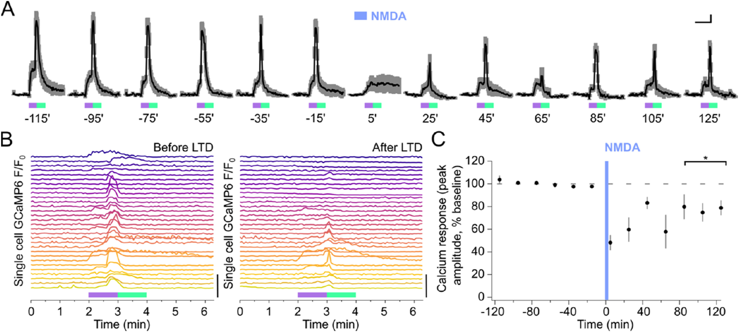 Figure 4 TCP9 allows tracking functional endogenous AMPA/KA GluRs during the induction of long-term depression. a) Cycles of photostimulation (violet rectangles, 1 min) and photodeactivation (green rectangles, 1 min) of TCP-conjugated cells in organotypic hippocampal slices were repeated every 20 min for 4 h. Each time point represents the beginning of the 6-min time-course of the GCaMP6s mean fluorescence signal ± SEM of n = 10 cells from one representative experiment. Baseline photoresponses were stable for 2 hours. Bath perfusion with 20 μM NMDA for 3 min (at time 0, blue square) reduced the magnitude of subsequent photoresponses for at least 125 min, confirming the induction of long-term depression (LTD). Scale bars represent 0.3-fold (F/F0) and 2 min. b) GCaMP6s fluorescence traces corresponding to individual neurons are shown before (-15 min) and after (25 min) NMDA application (n = 30 neurons from 4 slices). Scale bar indicates 10-fold increase (F/F0). c) Average of GCaMP6s peak amplitude photoresponses normalized to baseline (F/F0) over time shows a long-term decrease in photoresponse intensity of 25% (mean ± SEM of n = 4 independent slices). *p < 0.05 comparing the last 60 min period (85’-125’) with the 60 min baseline period before application of NMDA (Student’s paired t-test).