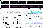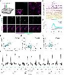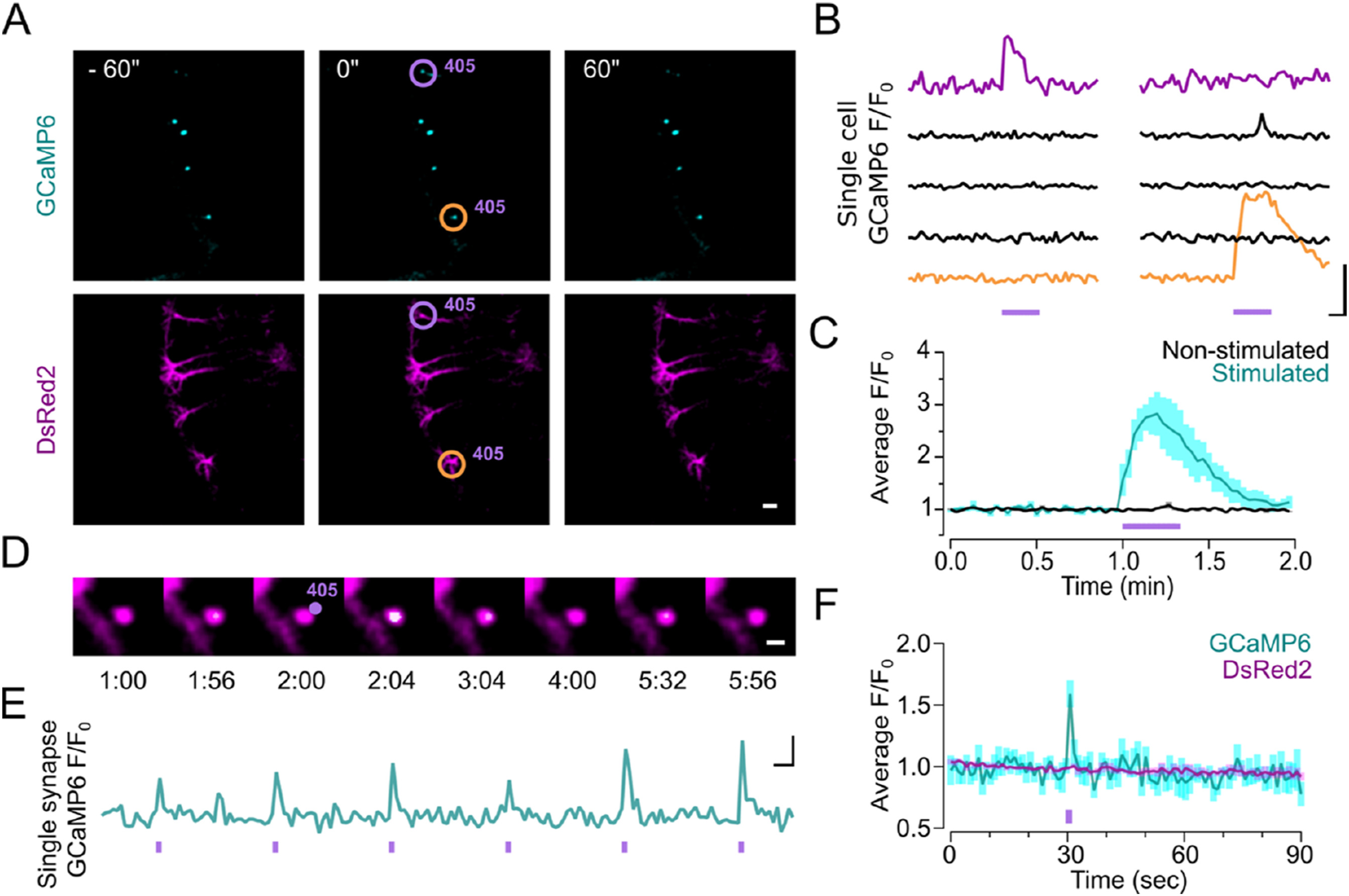 Figure 5 TCP9 enables robust, rapid, and reversible photocontrol of single-neuron and single-synapse activity in organotypic hippocampal slices. a) Time-lapse images of GCaMP6s (cyan) and DsRed2 (magenta) fluorescence of TCP9-evoked photoresponses on single neurons (purple circle cell photoactivated). Scale bar corresponds to 50 μm. Time in seconds. b) GCaMP6s signals from 5 single cells in the field of view in (a) after illumination for 20 s (purple bar) with a spotlight of 405 nm laser (0.81 mW·μm-2) on the soma (top trace corresponds to the cell circled in purple, and bottom trace to the cell circled in orange) photoactivated in two sequential experiments. Scale bars represent 5-fold (F/F0) and 10 sec. Note that green light is not required to switch off TCP9 because of continuous scanning with 488 nm imaging laser. c) Average GCaMP6s signal in the soma (mean ± SEM) normalized to baseline (F/F0) of stimulated cells (cyan, n= 6 cells from 5 slices) and non-stimulated neighboring cells (black, n= 12 cells from 5 slices), upon light stimulation of a single cell (20 s, purple rectangle, n= 6 cells from 5 slices). d) Time-lapse images of merged fluorescence signals from GCaMP6s (cyan) and DsRed2 (magenta) showing a TCP9-evoked photoresponse in a single spine. The 405 nm laser targeted a spot close to the tip of the spine head (purple dot) for 1 s. Time stamps are in min:sec. Scale bar 1 μm. e) Time course of GCaMP6s signal (F/F0) of a single spine repeatedly photostimulated with pulses of the 405 nm laser (1 s, 0.25 mW·μm-2, purple rectangles) at the tip of the same spine. Scale bars represent 0.5-fold (F/F0) and 5 s. f) Average fluorescence signal of GCaMP6s and DsRed2 in the spine head (mean ± SEM) normalized to baseline (F/F0) upon light stimulation of a single spine (1 s, purple rectangle, n= 5 spines from 5 slices). Photoresponse parameters (peak amplitude, latency and AUC) of single cells and single spines in TCP conjugated and non-conjugated slices are compared in Fig. S5.