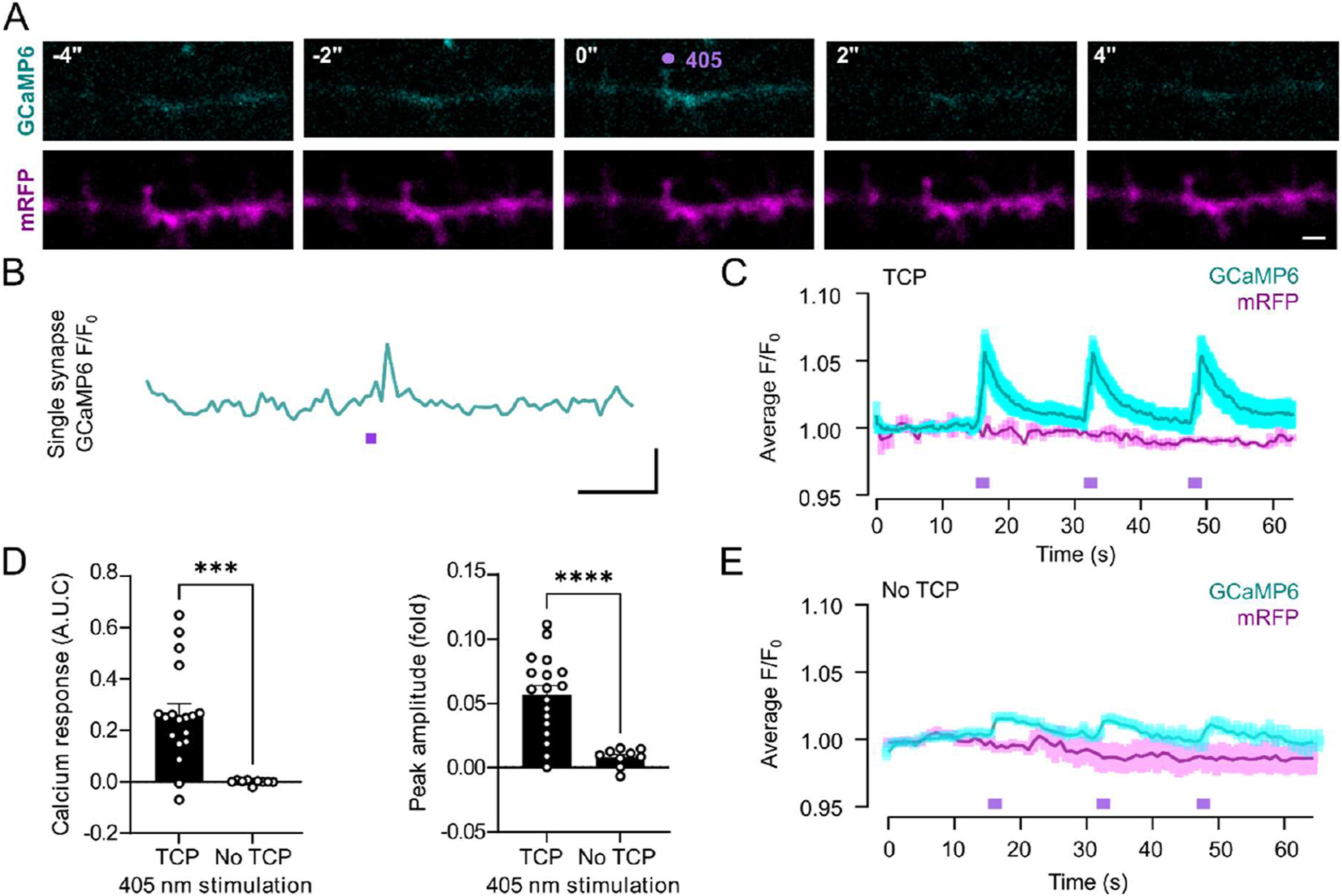 Figure 7 TCP9 enables the photocontrol of single synapses in vivo. a) Time-lapse images of a spiny dendrite of a Xenopus laevis OB neuron electroporated with GCaMP6s (cyan) and mRFP (magenta) at developmental stage 28-30 and recorded 8 days later. Tadpoles were incubated once with 250 μM TCP9 for 15 min, and evoked activity experiments were carried out in the next 5 hours. Scale bar 2 μm. b) Time course of GCaMP6s fluorescence signal from a single dendritic spine photostimulated by a 500 ms spotlight of 405 nm laser (0.37 mW, violet rectangle). Scale bars indicate 0.02 F/F0 and 10 s. c) Time course of averaged GCaMP6s and mRFP fluorescence signals (mean ± SEM) normalized to baseline (F/F0) of consecutive photoactivations (405 nm, 500 ms, 0.37 mW, each violet rectangle) of n = 3 single dendritic spines from 3 different tadpoles in vivo. d) Comparison of overall photoresponses measured as area under the curve (AUC) of integrated GCaMP6s fluorescence signals and peak amplitude (fold of F/F0) between TCP-treated tadpoles (data shown in panel c) and TCP-untreated tadpoles (data shown in panel e). Statistical analysis by Mann-Whitney test (***p = 0.0005) for AUC, and unpaired t-test with Welch’s correction (****p < 0.0001) for peak amplitude. e) Time course average of GCaMP6s and mRFP fluorescence signals (mean ± SEM) normalized to baseline (F/F0) in single spines in OB cells in control TCP9-untreated tadpoles after 3 consecutive 500 ms photostimulations (405 nm, 0.78 mW, violet rectangles, n=3 different spines from the same tadpole).
