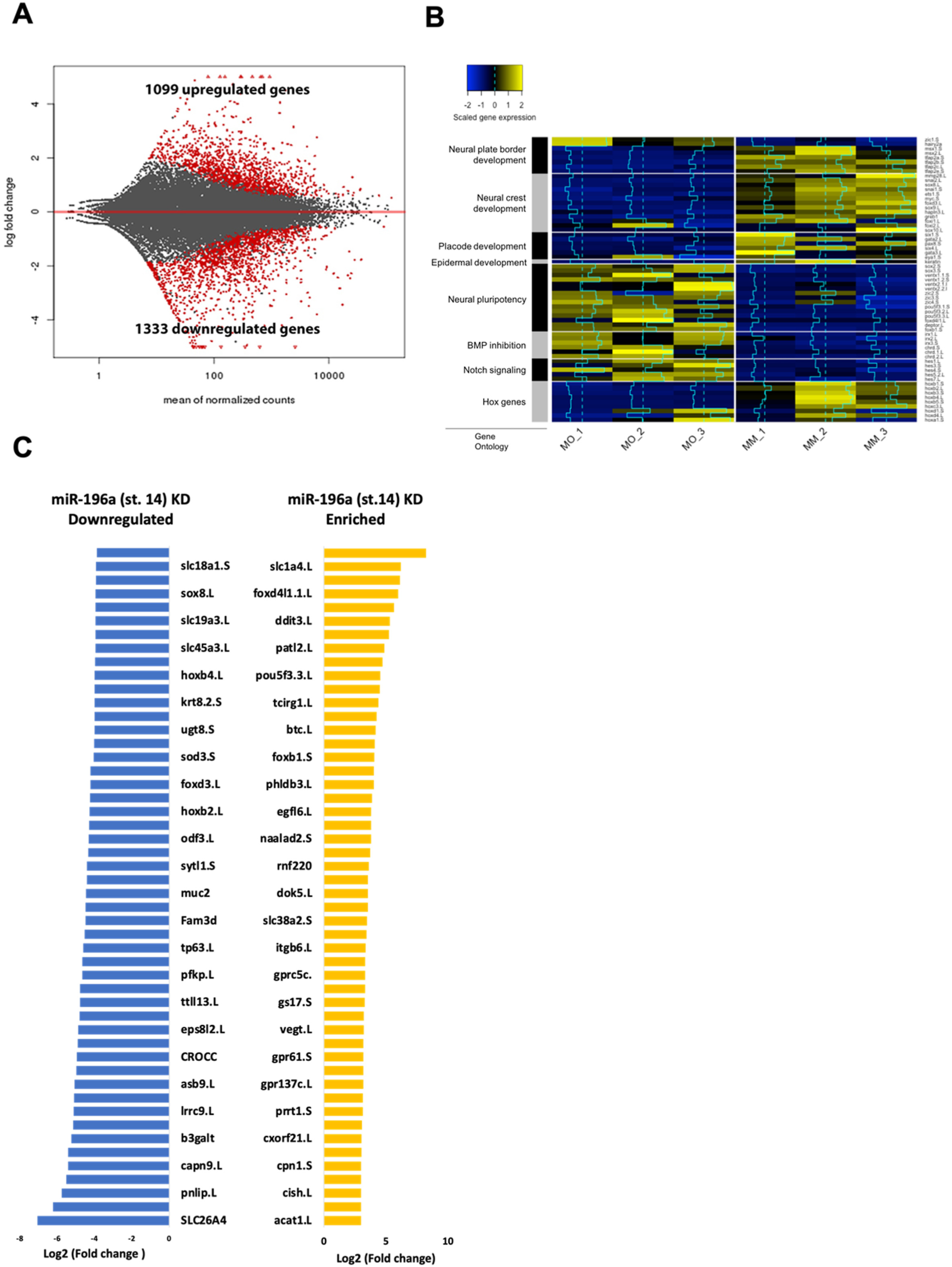 Neural crest (NC) cells form a multipotent stem cell population specified during neurulation, which undergo an epithelial-to-mesenchymal transition (EMT) and migrate extensively in the developing embryo, to generate numerous tissues and cell types including the craniofacial skeleton, the peripheral nervous system and pigment cells. The genetic and molecular details of NC specification are governed by a complex, yet still partially understood gene regulatory network (NC-GRN). In particular, the precise function of microRNAs (miRNA) in this network remains poorly characterized. MiRNAs are short non-coding 20-22 nucleotides long RNAs, which control gene expression through post-transcriptional repression. Since miRNA-196a is expressed in the developing neural and NC cells of Xenopus laevis embryos, we here investigated miR-196a function in the NC-GRN, by knocking-down its expression using antisense morpholinos. Depletion of miR-196a revealed major NC and craniofacial phenotypes. These defects were preceded by the perturbed expression of key neural, neural border and NC markers such as sox2/3, zic1/3, pax3, sox10 and snail2. Using RNA sequencing of individual neural border and NC explants, we have identified a signature of genes up- and down-regulated by miR-196a and validate these with rescue experiments using a miRNA mimic. Our study identifies miR-196a as a key actor of early patterning in the dorsal ectoderm, balancing the extent of immature neural plate progenitors with NC and placode specification, while also promoting neuron differentiation within the neural plate.