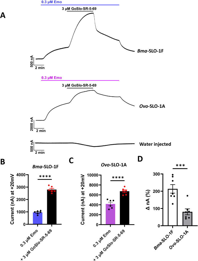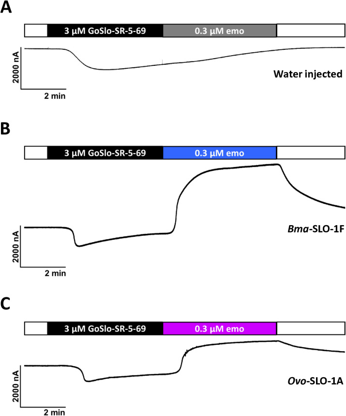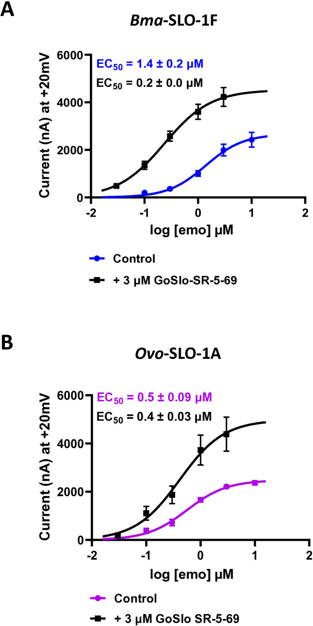 Positive allosteric modulation of emodepside sensitive Brugia malayi SLO-1F and Onchocerca volvulus SLO-1A potassium channels by GoSlo-SR-5-69.