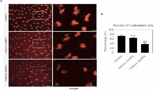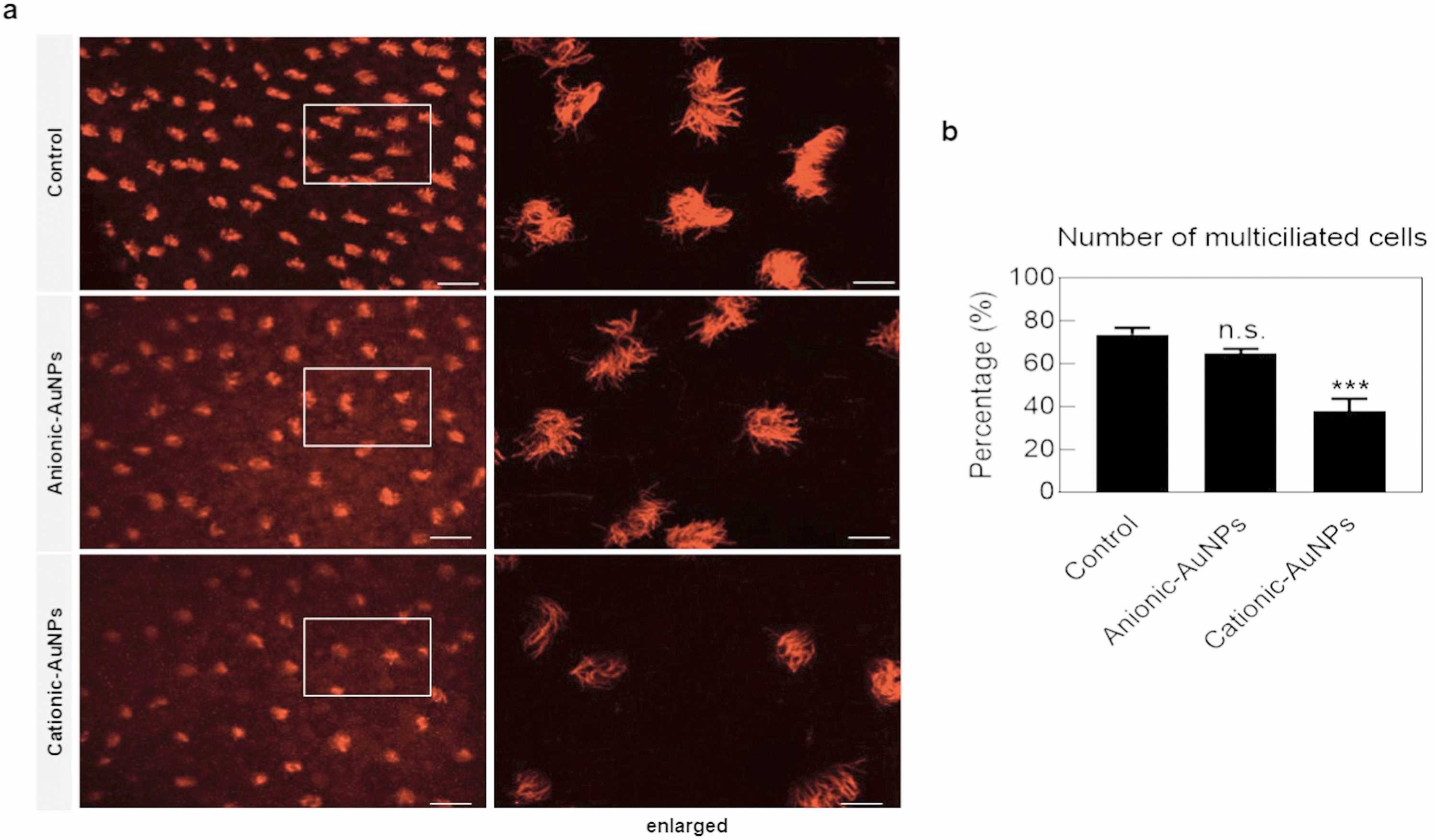 The surface chemistry and physical characteristics of gold nanoparticles (AuNPs) influence their biological interactions and toxicological responses. However, the toxicological effects of surface charge on embryonic development remain poorly understood. In this study, we investigated the in vivo developmental toxicity and teratogenicity of differentially charged AuNPs during early embryogenesis of Xenopus laevis - a sensitive and ecologically relevant animal model for developmental toxicology. Our study indicated that cationic AuNPs induced significant embryotoxicity and teratogenicity including lethality, phenotypical abnormalities and disruption of gene expression associated with liver, digestive tract, neural, and eye development. In contrast, such effects, including lethality and malformations associated with changes in gene expression were not observed in embryos exposed to anionic AuNPs. In addition, cationic AuNPs affected ciliogenesis by reducing the number of multiciliated cells and disturbing cilia-driven fluid flow, a critical endpoint in nanoparticle-induced toxicity. Furthermore, gene expression profiles suggested that necroptosis might be the mechanism of cell death in embryos exposed to cationic AuNPs. Notably, the surface charge dependent AuNPs exposure leading to impaired ciliogenesis and activation of necroptosis during embryogenesis represents significant endpoints in nanotoxicology. Unlike previous studies focusing on zebrafish or rodents, this study provides the first systematic evaluation in X. laevis embryos with identical nanoparticle cores but distinct surface chemistries. Our study underscores the significance of nanoparticle surface functionalization in determining developmental toxicity and pinpoints the ecological risks imposed by cationic AuNPs during early embryonic development in aquatic systems.