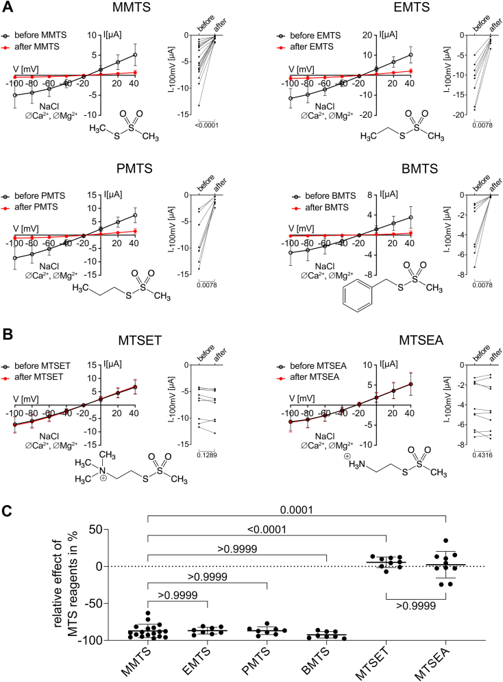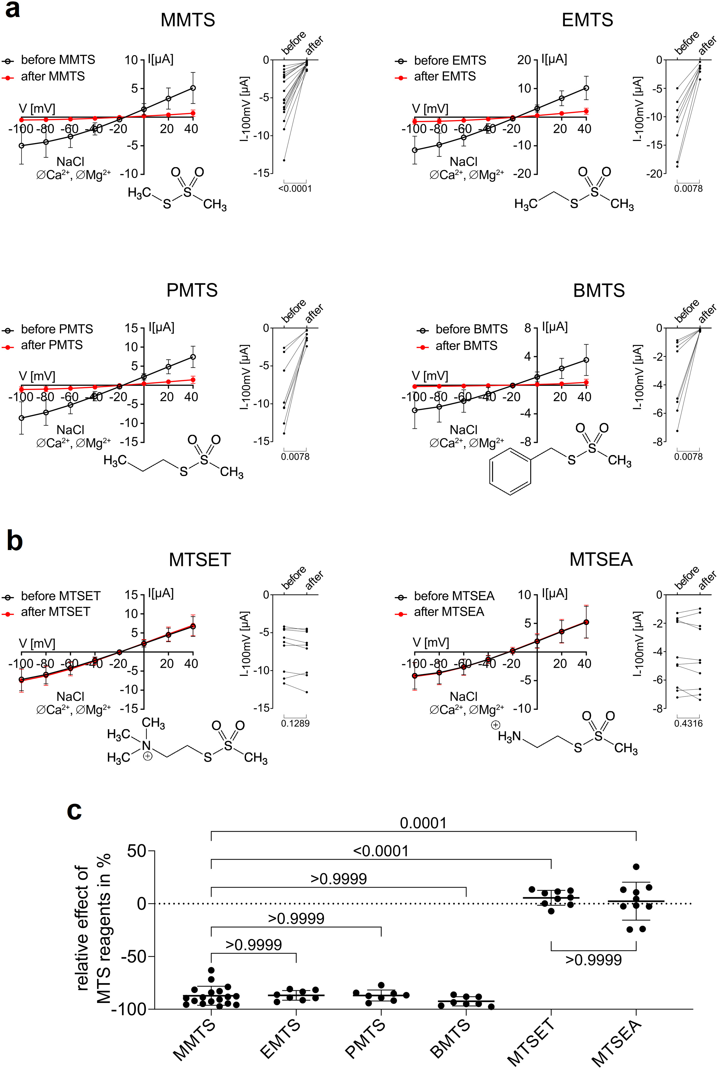 Figure 4 Lipophilic but not positively charged MTS reagents inhibit PC2 F604P a, b Whole-cell currents in oocytes expressing PC2 F604P were detected before and after 5 min incubation with different lipophilic (a) or positively charged (b) MTS substances (1 mM). Experiments were performed as described in Figure 3. The MMTS data are the same as shown in Figure 3 a, b. Left panels Average I/V plots (mean ± SD) obtained in NaCl ØCa2+ØMg2+ solution before and after incubation with the MTS reagent as indicated. Chemical structures of the corresponding substances are shown below the corresponding I/V plots. Right panels Summary data from the experiments shown in the corresponding left panels depict maximal inward current values reached at −100 mV before and after incubation with the respective MTS reagent. Lines connect data points obtained from the same oocyte. P-values were calculated using Wilcoxon matched-pairs signed rank test. c, Relative effect of MTS reagents in % calculated using the current values shown in right panels in a and b: (𝐼−100𝑚𝑉[𝑎𝑓𝑡𝑒𝑟]/𝐼−100𝑚𝑉[𝑏𝑒𝑓𝑜𝑟𝑒]−1)×100%. P-values were calculated using Kruskal-Wallis and Dunn’s multiple comparisons test (N=5, n=18 for MMTS as in Figure 3b; N=2, n=8-10 for all other MTS substances; N indicates the number of different batches of Xenopus laevis oocytes, and n indicates the number of individual oocytes analyzed per experimental group). |