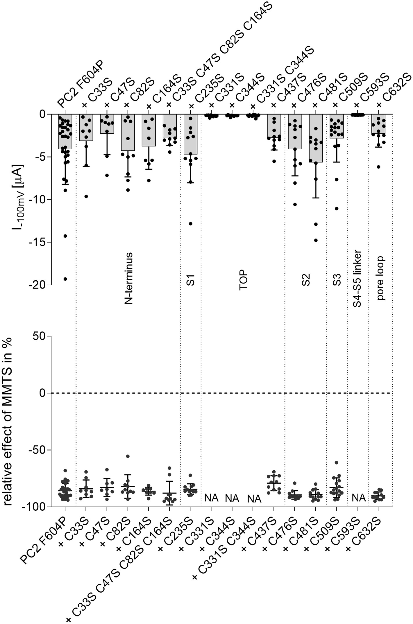 Figure 8. Screening mutagenesis revealed C593 as a crucial cysteine residue for PC2 F604P ion channel function. Whole-cell current values from oocytes expressing PC2 F604P without or with specified cysteine to serine substitutions were obtained essentially as described in Figure 3. Upper panel: maximal baseline inward currents in NaCl ØCa2+ØMg2+ solution at −100 mV (mean + SD and individual data points) are shown. Lower panel: relative inhibitory effect of MMTS in % was calculated as described in Figure 4. This calculation was not applicable (NA) to mutants that exhibited no detectable ion channel activity (N = 1–5, n = 8–31; N indicates the number of different batches of Xenopus laevis oocytes, and n indicates the number of individual oocytes analyzed per experimental group). PC2, polycystin-2; MMTS, methyl methanethiosulfonate. |