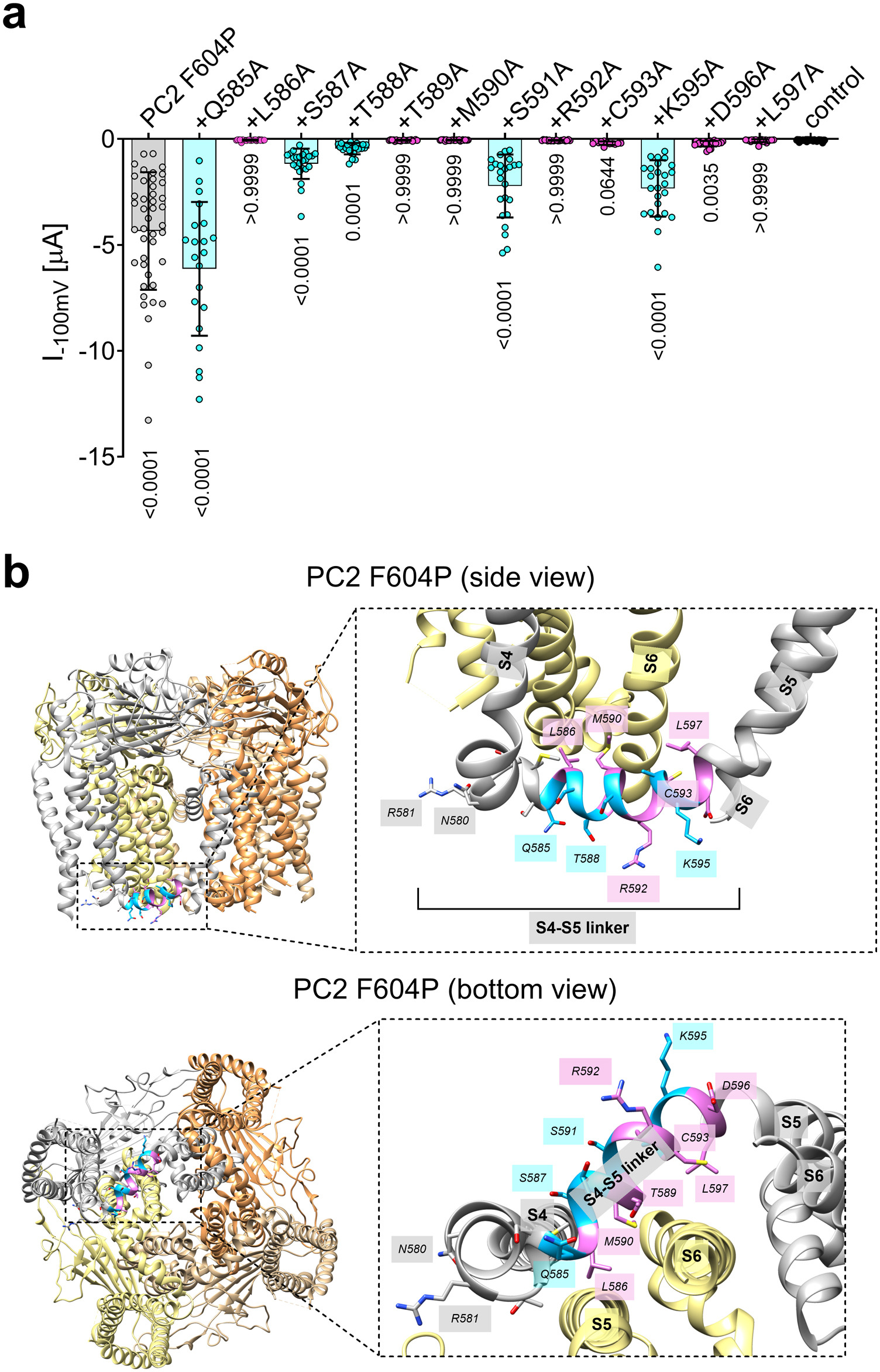 Figure 11 The apparent molecular interaction of the S4-S5 linker of one PC2 subunit with the adjacent S6 transmembrane domain of the neighboring subunit is probably critical for PC2 F604P ion channel function a, In experiments as described in Figure 3 whole-cell currents were measured in oocytes expressing PC2 F604P without or with additional alanine substitutions as specified. Maximal baseline inward currents in NaCl ØCa2+ØMg2+ solution at -100 mV (mean + SD and individual data points) are shown. Alanine mutants of PC2 with (partially) preserved ion channel function are colored in cyan, mutants with a complete LOF effect are colored in magenta. P-values for comparisons with the control group were calculated using Kruskal-Wallis and Dunn’s multiple comparisons test (N=2-5, n=12-45; N indicates the number of different batches of Xenopus laevis oocytes, and n indicates the number of individual oocytes analyzed per experimental group). b, Side and bottom view of human PC2 F604P in ribbon representation generated using atom coordinates from PDB entry 6D1W (23). Individual PC2 subunits are depicted in different colors. The insets show a portion of PC2 F604P on an expanded scale. Residues within the S4-S5 linker are in sticks representation and colored in cyan or magenta according to the functional data shown in a. |