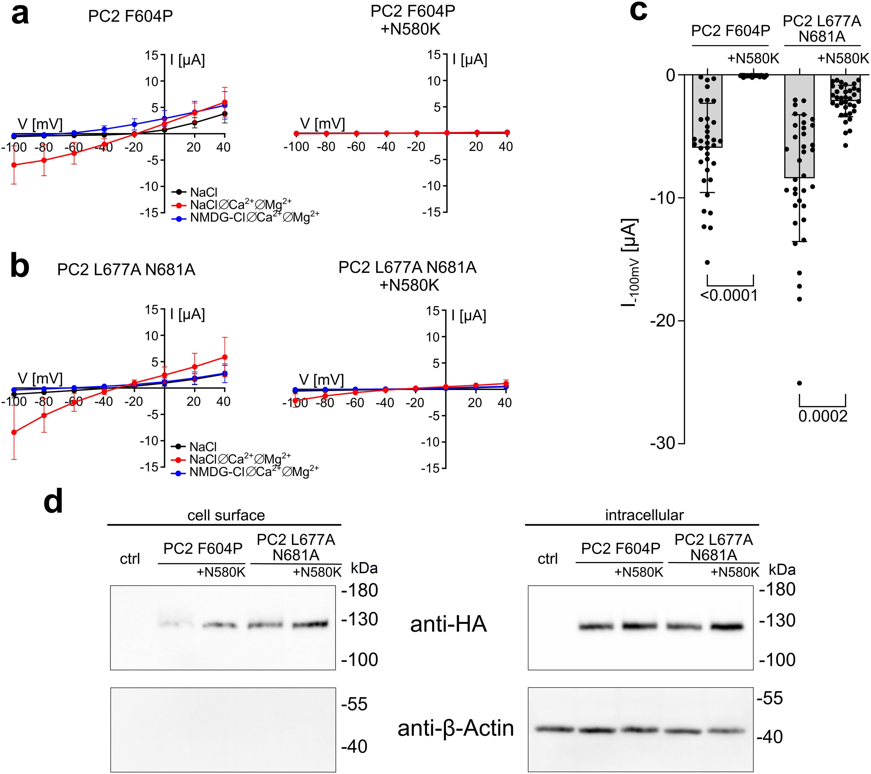 Figure 12 ADPKD-associated mutation N580K in the S4-S5 linker disturbs the ion channel function of PC2 GOF constructs a, b, Average I/V plots (mean ± SD) in different solutions as indicated were obtained as described in Figure 3 in oocytes expressing PC2 F604P (a) or PC2 L677A N681A (b) without (left panels) or with (right panels) the additional ADPKD-associated mutation N580K. c, Summary data from the same experiments shown in a, b demonstrating maximal inward currents reached at -100 mV in NaCl ØCa2+ØMg2+ bath solution (mean ± SD and individual data points are shown; N=4, n=35-36; N indicates the number of different batches of Xenopus laevis oocytes, and n indicates the number of individual oocytes analyzed per experimental group). P-values were calculated using Kruskal-Wallis and Dunn’s multiple comparisons test. d, Western blot analysis of cell surface (left panels) and intracellular (right panels) expression of PC2 constructs in oocytes from one batch performed as described in Figure 9. Similar results were obtained in 3 additional experiments shown in Figure S7-S9. |