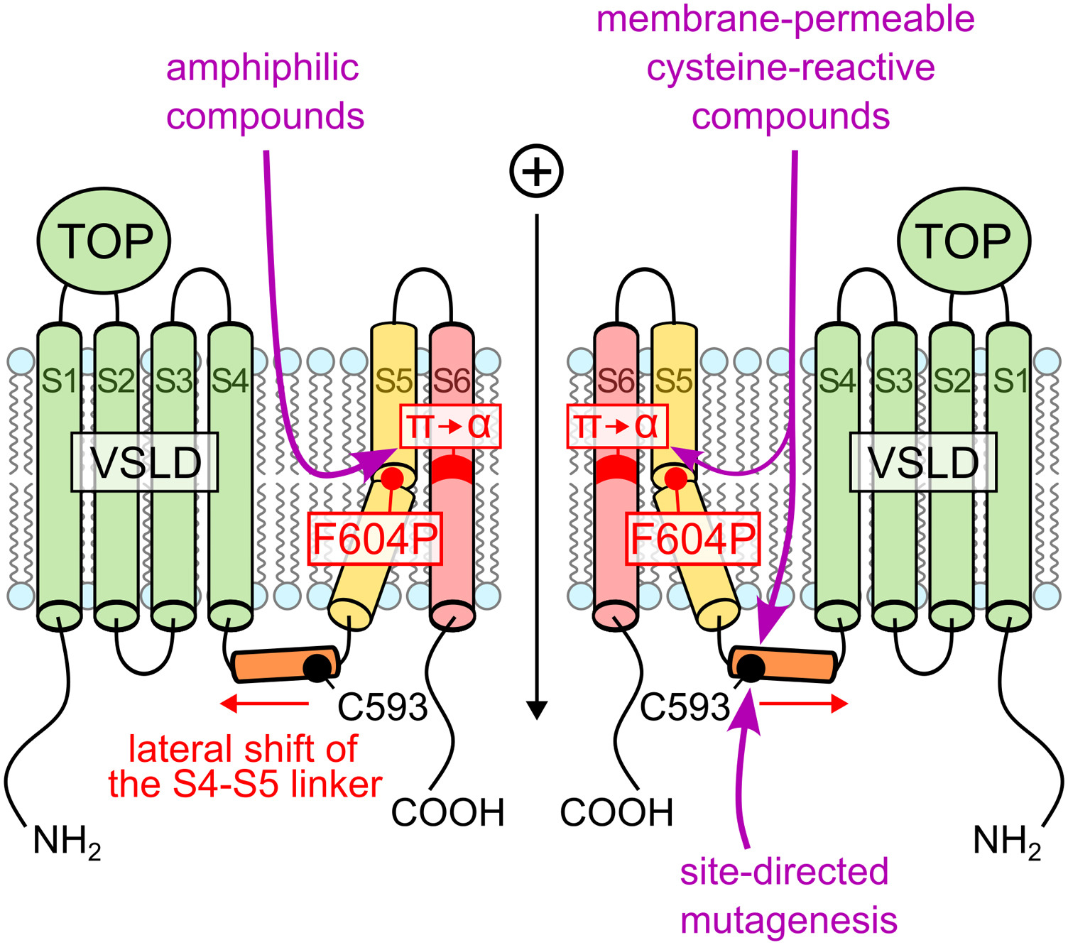 Figure 13. Membrane-permeable cysteine-reactive compounds, amphiphilic substances, and mutations within the S4-S5 linker inhibit the PC2 F604P channel, probably by disturbing the π-to-α transition in the S6 domain. The F604P mutation induces a conformational change in S5, which causes a lateral shift of the S4-S5 linker and triggers a π-to-α helix transition in S6 that opens the channel pore. Membrane-permeable cysteine-reactive compounds may covalently modify C593 in the S4-S5 linker, altering its conformation and disrupting its interactions with S6, thereby preventing the π-to-α transition. Mutations within the S4-S5 linker likely act in a similar manner. Alternatively, membrane-permeable cysteine-reactive compounds, like amphiphilic substances, may change membrane properties and alter lipid–protein interactions, also interfering with the π-to-α switch in S6. TOP, tetragonal opening of polycystins; VSLD, voltage sensor–like domain; S1-S6, transmembrane domains 1 to 6; π, π helix; α, α helix; PC2, polycystin-2. |