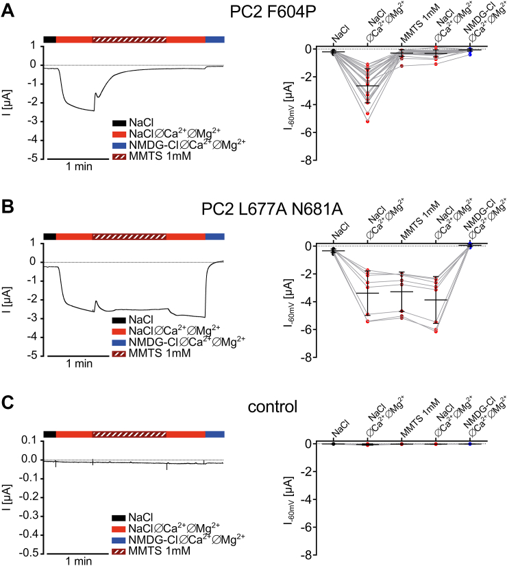 Figure 2. MMTS acutely inhibits PC2 F604P but not PC2 L677A N681A.Left panels: representative whole-cell current traces obtained from an oocyte expressing PC2 F604P (A) or PC2 L677A N681A (B) or from a control oocyte (C) clamped at −60 mV. Different bath solutions were applied as indicated by bars. MMTS (1 mM) was applied in a NaCl ØCa2+ØMg2+ bath solution. Note that the brief transient initial inhibition of PC2 mediated currents in response to MMTS exposure is probably an artifact caused by the solution exchange and minor contamination of the superfusing solution with divalent cations. Right panels: summary data from similar experiments as shown in the corresponding left panels. Inward current values reached in each extracellular solution as indicated are shown. Mean ± SD and individual data points are shown (a: N = 3, n = 26; b: N = 1, n = 8; c: N = 2, n = 6; N indicates the number of different batches of Xenopus laevis oocytes, and n indicates the number of individual oocytes analyzed per experimental group). Lines connect data points obtained from the same oocyte. Dotted line indicates zero current level. PC2, polycystin-2; MMTS, methyl methanethiosulfonate. |