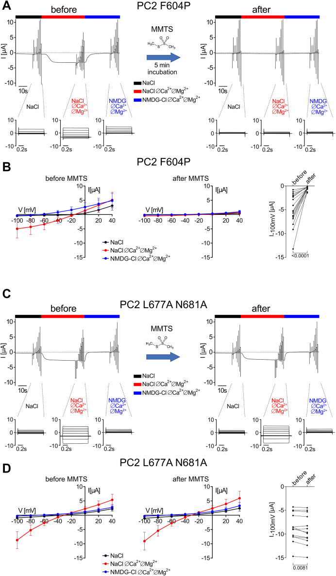 Figure 3. PC2 F604P but not PC2 L677A N681A was strongly and irreversibly inhibited by incubation with MMTS (1 mM).A and C, representative whole-cell current traces obtained in an oocyte expressing PC2 F604P (A) or PC2 L677A N681A (C) before (left panels) and after (right panels) 5 min incubation in ND9 solution supplemented with MMTS (1 mM). Application of different bath solutions during the current measurement is indicated by bars. For each condition, a voltage step protocol was performed with consecutive 1000 ms voltage steps in 20 mV increments starting with a hyperpolarizing pulse to −100 mV from a holding potential of −60 mV. Overlays of the corresponding whole-cell current traces are shown below the traces for each bath solution. The oocyte was not clamped during the incubation with MMTS. Before the second current measurement, MMTS was washed out with NaCl bath solution. Impaling microelectrodes were not removed from the oocyte until the end of the experiment. B and D, left and middle panels: average I/V plots (mean ± SD) were constructed from similar experiments as shown in (A) and (C) using the mean current values measured during the last 300 ms of the voltage pulses. Data points represent average values from 13 to 18 oocytes (B: N = 5, n = 18; D: N = 4, n = 13; N indicates the number of different batches of Xenopus laevis oocytes, and n indicates the number of individual oocytes analyzed per experimental group). Right panels: summary data from the same experiments shown in left and middle panels demonstrate maximal inward current values reached during application of hyperpolarizing pulses of −100 mV in NaCl ØCa2+ØMg2+ solution before and after MMTS application. Lines connect data points obtained from the same oocyte. p values are calculated using Wilcoxon matched-pairs signed rank test. PC2, polycystin-2; MMTS, methyl methanethiosulfonate. |