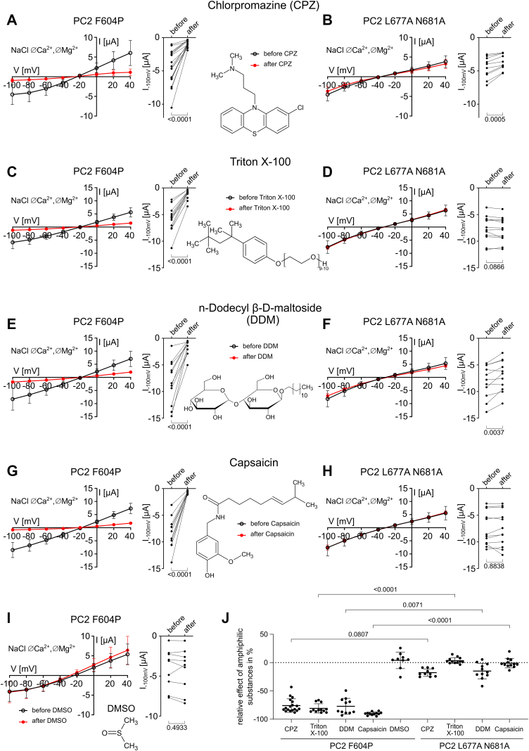 Figure 10 Structurally unrelated amphiphilic compounds inhibited PC2 F604P but not PC2 L677A N681A a-i Whole-cell currents in oocytes expressing PC2 F604P (a, c, e, g, i) or PC2 L677A N681A (b, d, f, h) were detected before and after 5 min incubation with chlorpromazine (CPZ; 0,25 mM; a, b), Triton X-100 (0.1 mM; c, d), n-dodecyl β-D-maltoside (DDM; 0.1 mM; e, f), capsaicin (0.5 mM) or with DMSO used as vehicle (1:200; i) essentially as described in Figure 3. Left panels Average I/V plots (mean ± SD) in NaCl ØCa2+ØMg2+ bath solution before and after incubation with the indicated substance. Right panels Summary data from the experiments shown in corresponding left panels demonstrating maximal inward currents in individual oocytes reached at -100 mV in NaCl ØCa2+ØMg2+ bath solution before and after treatment with the indicated substance. P-values were calculated using paired two-tailed Student’s t-test. j, Relative effect of amphiphilic substances on currents at -100 mV in % was calculated as described in Figure 4 using the current values shown in a-i. P-values were calculated using Kruskal-Wallis and Dunn’s multiple comparisons test (N=1-2, n=9-18; N indicates the number of different batches of Xenopus laevis oocytes, and n indicates the number of individual oocytes analyzed per experimental group). |
