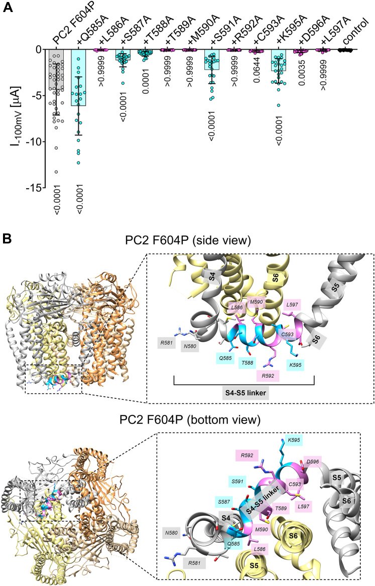 Figure 11. The apparent molecular interaction of the S4-S5 linker of one PC2 subunit with the adjacent S6 transmembrane domain of the neighboring subunit is probably critical for PC2 F604P ion channel function.A, in experiments as described in Figure 3, whole-cell currents were measured in oocytes expressing PC2 F604P without or with additional alanine substitutions as specified. Maximal baseline inward currents in NaCl ØCa2+ØMg2+ solution at −100 mV (mean ± SD and individual data points) are shown. Alanine mutants of PC2 with (partially) preserved ion channel function are colored in cyan, mutants with a complete LOF effect are colored in magenta. p values for comparisons with the control group were calculated using Kruskal–Wallis and Dunn's multiple comparisons test (N = 2–5, n = 12–45; N indicates the number of different batches of Xenopus laevis oocytes, and n indicates the number of individual oocytes analyzed per experimental group). B, side and bottom view of human PC2 F604P in ribbon representation generated using atom coordinates from Protein Data Bank entry 6D1W (23). Individual PC2 subunits are depicted in different colors. The insets show a portion of PC2 F604P on an expanded scale. Residues within the S4-S5 linker are in sticks representation and colored in cyan or magenta according to the functional data shown in (A). PC2, polycystin-2; LOF, loss of function. |