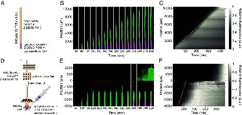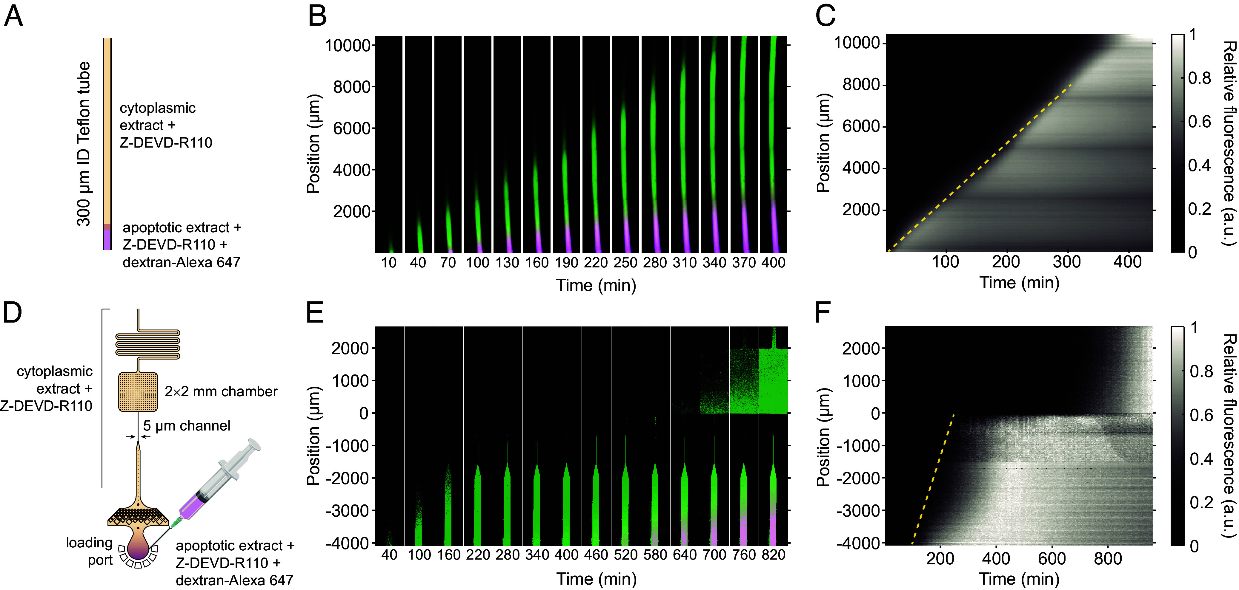 Fig. 2. Apoptotic trigger waves in cytoplasmic extracts in a Teflon tube and in a microfluidic apparatus (A) Schematic of the Teflon tube set up. (B) Trigger wave propagation in the Teflon tube, depicted by snapshots taken at 30 min intervals. The green signal represents the normalized R110 fluorescence, which is a measure of caspase-3/7 activity, and the magenta signal indicates normalized 10 kDa-dextran-Alexa 647 fluorescence, which is a diffusion marker. (C) Kymograph of the caspase-3/7 activity for the experiment shown in panel B. The grayscale represents normalized R110 fluorescence intensity calculated by maximum projection. The yellow dashed line depicts the approximately constant speed of 27 μm min−1. (D) Microfluidic device with a 5 μm thin channel and a 2 × 2 mm chamber. (E) Snapshots at different time points showing apoptosis spreading linearly up the thin channel, stalling at the channel/chamber junction, and ultimately spreading into and through the chamber. (F) Kymograph of the caspase-3/7 activity for the experiment shown in panel E. The yellow dashed line again shows a speed of 27 μm min−1.