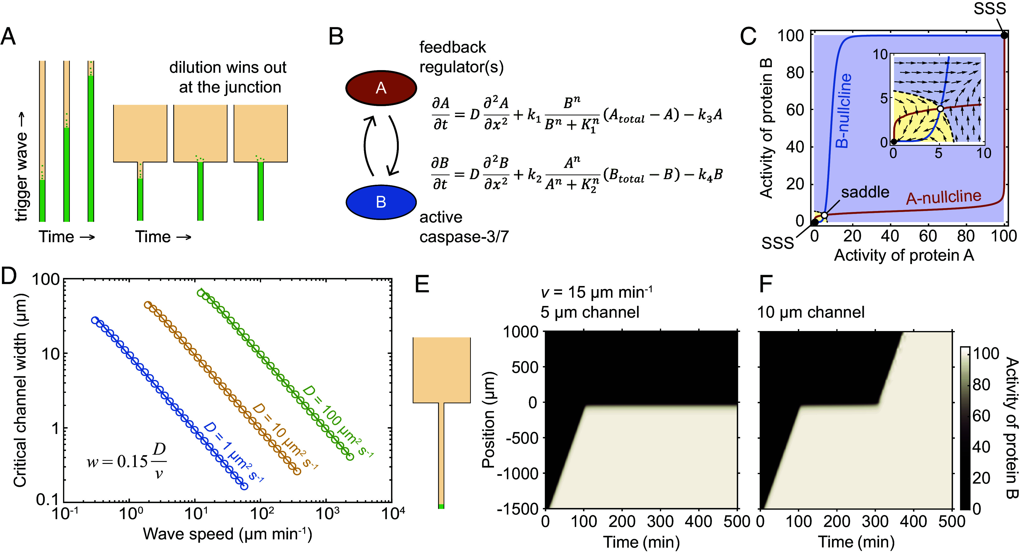 Fig. 1. Modeling trigger wave propagation and compartmentalization (A) Schematic view of how a junction between a thin channel and a larger chamber could, in principle, arrest trigger wave propagation. (B) A two-variable partial differential equation model of caspase-3/7 activation. (C) Phase plane analysis of the reactions in the model of caspase-3/7 activation. The sigmoidal nullclines are shown in red ∂A∂t=0 and blue ∂B∂t=0. They intersect at the two SSSs and the saddle, which are denoted by filled and unfilled circles, respectively. The manifold of the living SSS is shaded yellow and the manifold of the apoptotic SSS is shaded blue. The separatrix is shown as a dashed curve. Parameters were chosen such that activation of a few percent of the A or B proteins would trigger a switch from the living SSS to the apoptotic SSS, and the rate constants were adjusted to yield trigger waves with realistic speeds (30 µm min−1 for cytoplasm and 15 µm min−1 for cytosol). The Inset shows a magnified view of the region around living SSS and saddle. The constant-length arrows show the direction of the vector field. The basin of attraction of the lower (living) steady state is shown in yellow and that of the higher (apoptotic) steady state is shown in blue. (D) The modeled critical channel width is directly proportional to the diffusion coefficient D and inversely proportional to the trigger wave speed v. The PDE model shown in panel (B) was solved numerically to simulate the propagation of an apoptotic up thin channel and into a large chamber. For each choice of D and the time scale for the reactions, we calculated the resulting trigger wave speed v and the critical channel width w. The results agreed closely with the equation w=aDv. The lines are linear fits to the log–log data; all slopes were essentially −1 (−0.9997, −1.0009, and −0.9913 for D = 1, 10, and 100 µm2 s−1 respectively). The coefficient a was estimated to equal 0.15. (E and F) Calculated kymograph for the propagation of an apoptotic trigger wave in a device with a thin channel width just below (E) and just above (F) the critical value (6 µm in this case).