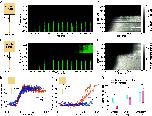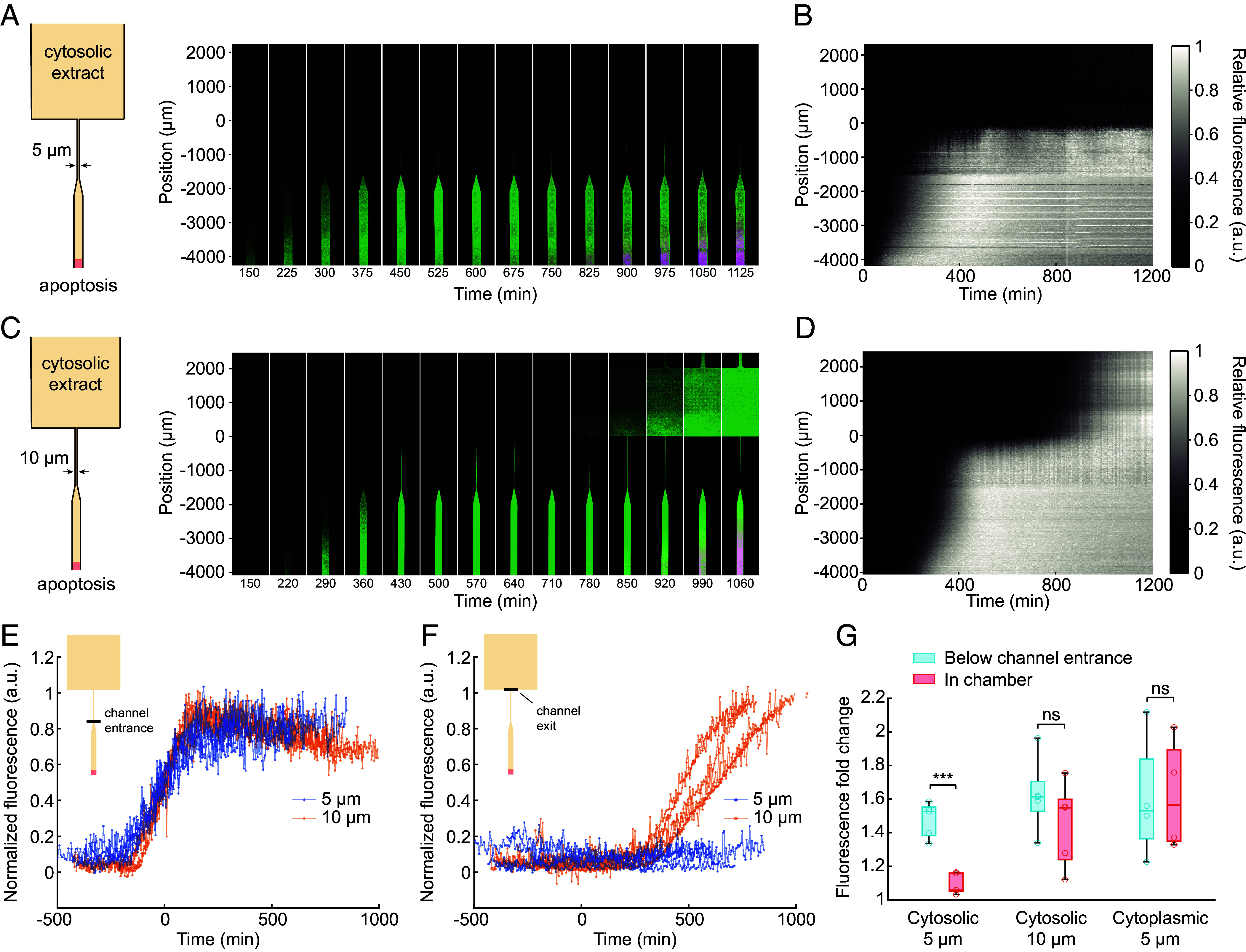 Fig. 3. Compartmentalization of apoptosis For cytosolic extracts, apoptosis is compartmentalized in a 5 µm channel and not in a 10 µm channel. (A) Snapshots, taken every 75 min, of apoptosis propagating in a cytosolic extract in an apparatus with a 5 µm channel. The green signal represents the normalized R110 fluorescence, and the magenta signal indicates normalized 10 kDa-dextran-Alexa 647 fluorescence. (B) Kymograph of the normalized caspase-3/7 activity for the experiment shown in panel (A). The grayscale shows the normalized fluorescence intensity of R110 calculated from the maximum projection. (C) Snapshots, taken every 70 min, of apoptosis propagating in a cytosolic extract in an apparatus with a 10 µm channel. Again the green signal represents the normalized R110 fluorescence, and the magenta signal indicates normalized 10 kDa-dextran-Alexa 647 fluorescence. (D) Kymograph of the normalized caspase-3/7 activity for the experiment shown in panel (C). The grayscale shows the normalized fluorescence intensity of R110 calculated from the maximum projection. (E) Time course of the normalized caspase-3/7 activity at the channel entrance (position = −1.5 mm) from ten independent experiments. Experiments with the 5 μm (n = 5) and 10 μm (n = 5) apparatus are labeled in blue and orange, respectively. The time frames were aligned so that increased caspase-3/7 activity is first seen at the channel entrance at t = 0. (F) Time course of the normalized caspase-3/7 activity at the channel–chamber junction (position = 0). Again, experiments with the 5 μm (n = 5) and 10 μm (n = 5) apparatus are labeled in blue and orange, respectively. The time frames were not aligned. Smoothed lowest and highest fluorescence intensities of the data were normalized to 0 and 1 respectively. (G) Fold-change of the average Z-DEVD-R110 fluorescence between the end and the beginning of the experiment, measured in regions above the channel/chamber junction (position > 0, blue) and below the start of the thin channel entrance (position < −1,500 μm, red). Fluorescence intensities were not normalized to min = 0 and max = 1 before calculating the fold changes. n = 5 for cytosolic 5 μm, n = 5 for cytosolic 10 μm, n = 4 for cytoplasmic 5 μm, ns: nonsignificant, ***P < 0.001.