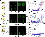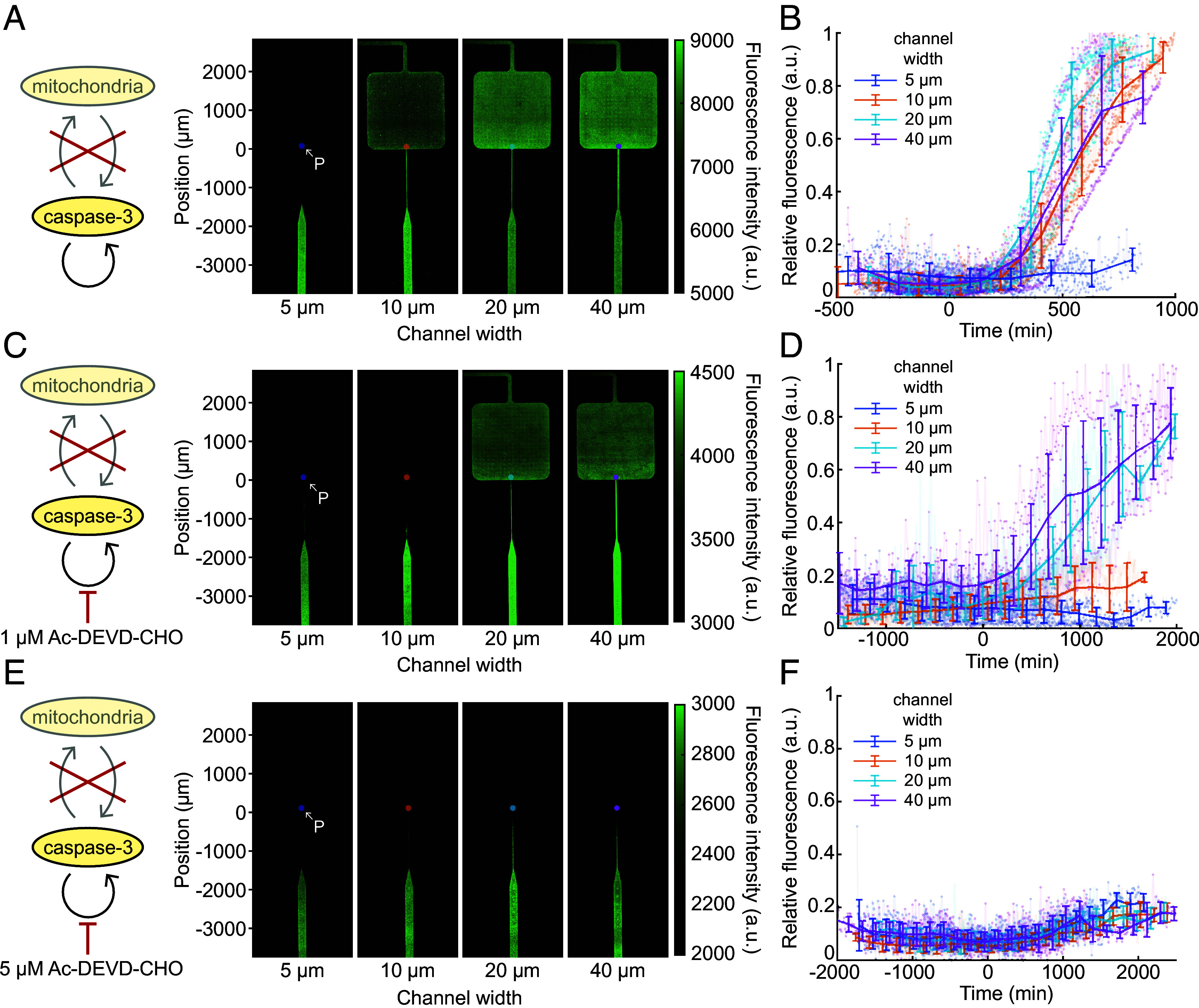 Fig. 4. Slowing the wave speed with the caspase-3/7 inhibitor Ac-DEVD-CHO increases the critical channel width. (A) Cytosolic extracts with no inhibitor added. Snapshots taken at the end of the experiment are shown for microfluidic devices with various channel widths, as indicated. (B) Pooled time course data from multiple independent experiments. The caspase-3/7 activity (relative R110 fluorescence) was taken as maximal projected fluorescence at the channel–chamber junction, shown as point P in panel (A). Data for the 5 and 10 µm channels are from five experiments and data for the 20 and 40 µm channels are from four experiments. Solid lines indicate the binned averages and error bars represent the SD for the points in that bin. (C) Cytosolic extracts with 1 µM Ac-DEVD-CHO added. Similar to panel (A). (D) Pooled time course data from multiple independent experiments. Similar to panel (B). (E) Cytosolic extracts with 5 µM Ac-DEVD-CHO added. Similar to panel (A). (F) Pooled time course data from multiple independent experiments. Similar to panel (B).