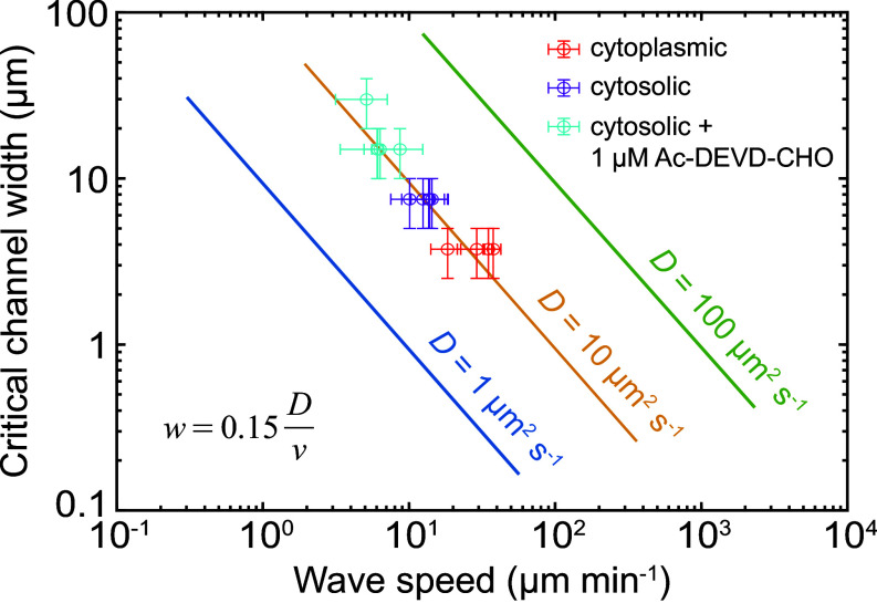 Fig. 5. Close agreement between theory and experiment for the dependence of the critical channel width on wave speed. The data points are from all of the experiments on cytoplasmic extracts, cytosolic extracts, and cytosolic extracts in Figs. 2–4. The lines are the theoretical curves shown in Fig. 1D. Both theory and experiment demonstrate that the critical channel width is inversely proportional to the trigger wave speed, and if the diffusion coefficient for the trigger wave mediator is 10 µm2 s−1, then the coefficient a in Eq. 3 is equal to 0.15. The error bars in the x-direction represent the SD of the wave speeds from each single experiment where four microfluidics devices with four channel widths (5, 10, 20, and 40 µm) were followed in parallel. The error bars in the y-direction represent the experimentally determined maximum and minimum limits for the critical channel widths.