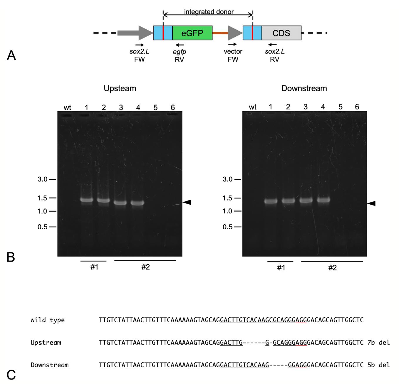 FIGURE 4 | Genotyping of F1 animals. (A) Scheme of an integrated target locus. PCR was performed with genomic DNAs obtained from F1 animals. Upstream and downstream sequences, including junctions between the donor and the target regions, were amplified using donor vector primers and gene- specific primers. Primer sequences are listed in Table S1. (B) Examples of PCR analysis for sox2.L:Egfp F1 embryos obtained from the founder #1 (1, 2) and founder #2 (3–6). PCR products for both upstream and downstream junction fragments were observed in DNAs from F1 embryos with specific eGFP expression (1–4) but not from embryos with ubiquitous eGFP (5, 6) or wild- type embryos (wt). Predicted sizes of the upstream and downstream PCR fragments are indicated as arrowheads. PCR products with larger or smaller sizes indicate insertion or deletion in the junctions. (C) Example of upstream and downstream junction sequences. The PCR products of sox2.L:Egfp F1 embryo (lane 3) were sequenced directly. Determined sequences are indicated with the wild- type partial sequence of the 5′ UTR. Underline indicates the sgRNA target sequence with PAM sequence (red underline).