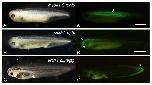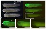 FIGURE 3 | Expression of eGFP in F1 siblings of sox2.L:Egfp. Representative images of F1 embryos (NF stage 33/34) obtained by crossing a female sox2.L:Egfp founder #2 (Table 3) and a wild- type male (A‑D). (A) bright field images. (A'), fluorescence image of (A). (B‑D) magnified view of each embryo in (A'). (B) specific eGFP signal is observed in brain (b), spinal cord (sc), optic vesicles (op), olfactory pit (ol), and otic vesicles (ot). (C) Ubiquitous eGFP signal at a low level is observed. (D) No eGFP signal is observed. Scale bar = 1 mm.