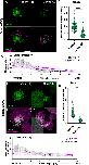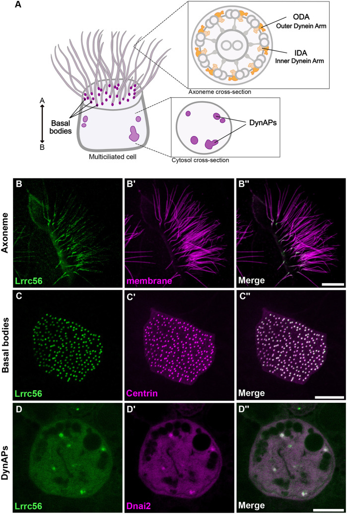 Fig. 1. Localization of GFP-Lrrc56 in Xenopus multiciliated cells. (A) Schematic of a vertebrate multiciliated cell (MCC). The upper inset shows a cross-section of an axoneme with the relative positions of outer dynein arms (ODAs) and inner dynein arms (IDAs). The bottom inset illustrates a representative cross-section of the MCC cytoplasm, highlighting dynein axonemal particles (DynAPs). (B,C,D) Representative in vivo confocal images showing GFP-Lrrc56 (green) localization along the length of ciliary axonemes, basal bodies and at cytosolic foci (DynAPs) in Xenopus MCCs. (B′,C′,D′) Membrane labeling with CAAX-RFP (magenta) marks motile cilia, Centrin-RFP (magenta) marks basal bodies, and mcherry-Dnai2 (magenta) labels DynAPs. (B″,C″,D″) Representative merged confocal images from the previous channels showing GFP-Lrrc56 (green) and the various markers (magenta). Scale bars: 10 µm. For this experiment, the sample size was n=9 per group/condition. The experiment was independently repeated at least three times with consistent results. |