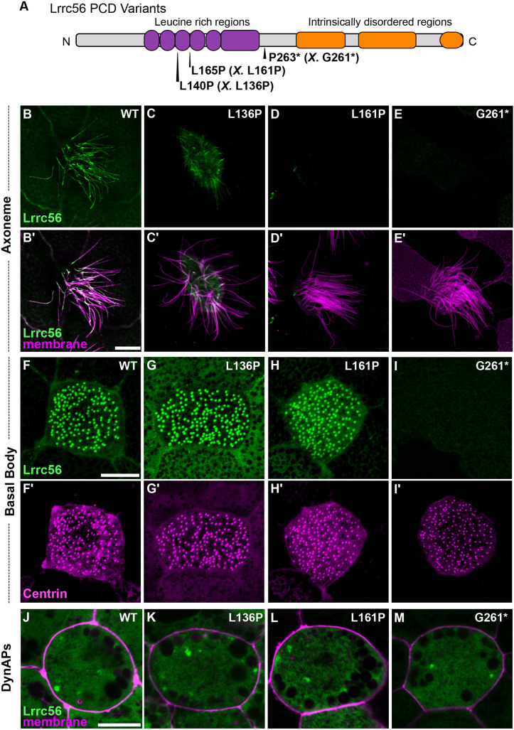 Fig. 2. Lrrc56 primary ciliary dyskinesia variants show a spectrum of localization defects. (A) Schematic of LRRC56 (UniProt ID: Q8IYG6), showing the leucine-rich regions and long intrinsically disordered C-terminus. The location of three human primary ciliary dyskinesia (PCD) variants L140P, L165P and D266* is indicated. The corresponding Xenopus alleles are in parentheses and indicated by ‘X’. (B,C,D,E) En face images of single MCCs showing Lrrc56 (green) axoneme localization for wild-type (WT; B), L136P (human L140P; C), L161P (human L165P; D), and D261* (human P263*; E) variants. Lrrc56 axonemal localization is disrupted in all three variants. (B′,C′,D′,E′) Merged images showing Lrrc56 (green) with membrane labeling (magenta) reveal normal motile cilia structure. (F,G,H,I) Representative en face images of Lrrc56 basal body localization for WT (F), L136P (G), L161P (H) and G261* (I) variants. Variants located at leucine-rich domains show normal localization to basal bodies, but G261* variant fails to localize at basal bodies. (F′,G′,H′,I′) Centrin (magenta) labeling of basal bodies for the corresponding WT (F′), L136P (G′), L161P (H′) and G261* (I′) variants. (J-M) Merged channels showing Lrrc56 (green) and membrane (magenta) show cytosolic localization for WT (J), L136P (K), L161P (L) and G261* (M) variants. Scale bars: 10 µm. This experiment was independently replicated at least three times, with (n=3) randomly selected embryos from each batch used per replicate. |