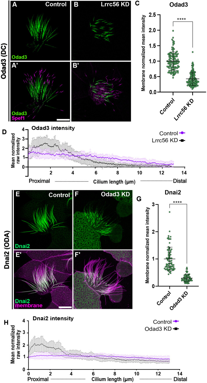 Fig. 5. Lrrc56 knockdown alters Odad3 localization at distal end of the motile axoneme. (A) In control MCCs, the docking complex subunit Odad3 (green) localizes along the length of the motile cilium. (A′) Merged image showing Odad3 (green) and the distal tip marker Spef1 (magenta). Odad3 is enriched throughout the axoneme, excluding the Spef1-positive distal domain. (B) In Lrrc56 KD MCCs, Odad3 localization to axonemes is decreased. (B′) Merged image of Odad3 (green) and Spef1 (magenta) in Lrrc56 KD cilia shows reduced Odad3 intensity along the axoneme. (C) Quantification of normalized Odad3 mean intensity in control and Lrrc56 KD MCCs. Mean intensity was measured from the base of the cilium to the beginning of Spef1 domain in individual cilia; mean intensity was normalized to membrane marker; each dot represents a motile cilium. (D) Quantification of raw mean normalized Odad3 intensity along the axoneme in control and Lrrc56 KD MCCs. In Lrrc56 KD MCCs, Odad3 signal is enriched at the proximal end of the axoneme compared to controls (control, N=33; Odad3 KD, N=33). (E) The ODA subunit Dnai2 (green) localizes along the axoneme in control MCCs. (F) In Odad3 KD MCCs, Dnai2 intensity is reduced along the axoneme, particularly at the distal end. (E′,F′) Merged image of Dnai2 (green) and a membrane marker (magenta) in control (E′) and Odad3 KD (F′) MCCs. (G) Quantification of Dnai2 mean intensity in control and Lrrc56 KD MCCs, normalized to a membrane marker. (H) Quantification of Dnai2 intensity along the cilium in control and odad3 KD MCCs. Plot shows representative axonemes (control, N=33; Odad3 KD, N=21). Statistical significance was determined using a non-parametric Mann–Whitney U-test. ****P<0.0001. Scale bars: 10 µm. |