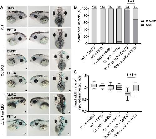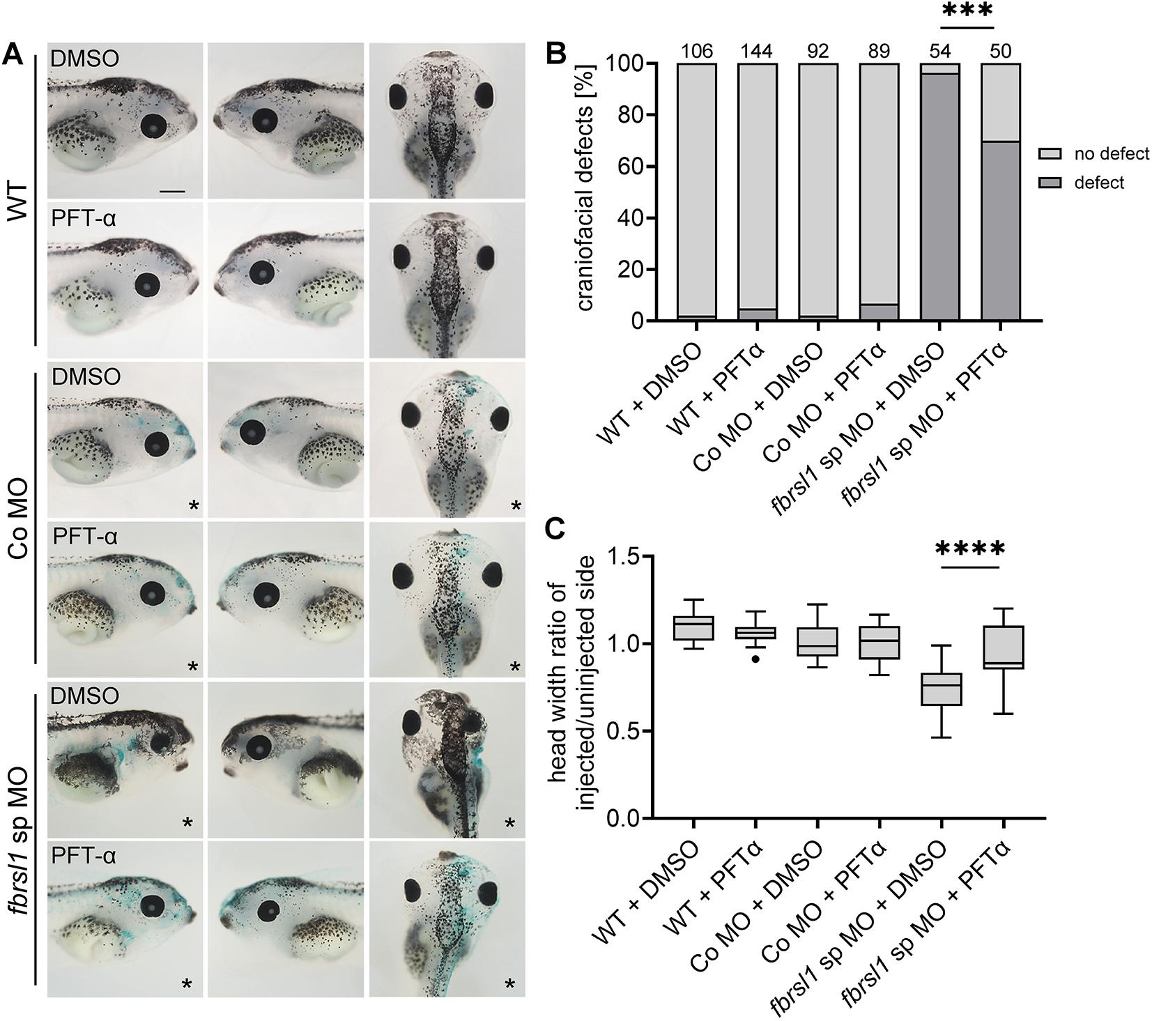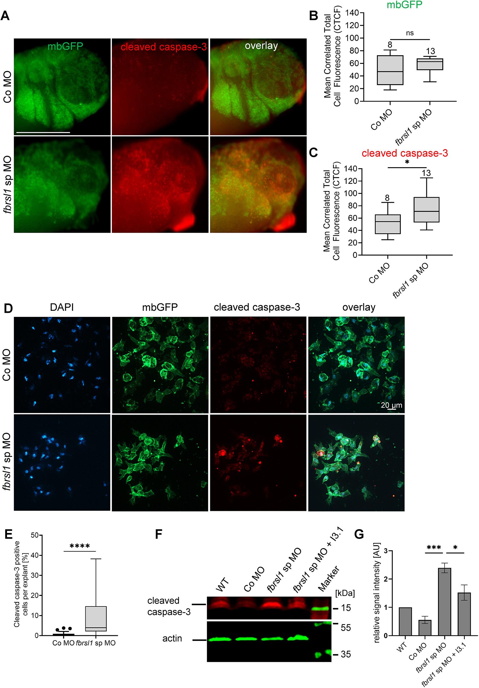 We recently identified a rare complex syndrome with craniofacial malformations caused by truncating variants in fibrosin-like 1 (FBRSL1). To investigate the function of Fbrsl1 in craniofacial development, we used the Xenopus laevis model to study the cranial neural crest (NC). While Fbrsl1 was largely dispensable for NC induction and early migration, its loss of function impaired NC differentiation and cartilage formation. This was accompanied by increased expression of p53 and cleaved caspase-3, as well as by exon skipping in the mdm2 gene, a negative regulator of p53. Fbrsl1 may directly affect splicing of mdm2, as we find that FBRSL1 interacts with the splicing factor SF3B1. Notably, pharmacological inhibition of p53 partially rescued the craniofacial phenotype, suggesting that p53-mediated apoptosis underlies the NC defects caused by loss of Fbrsl1 function.