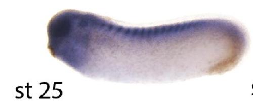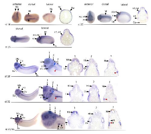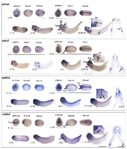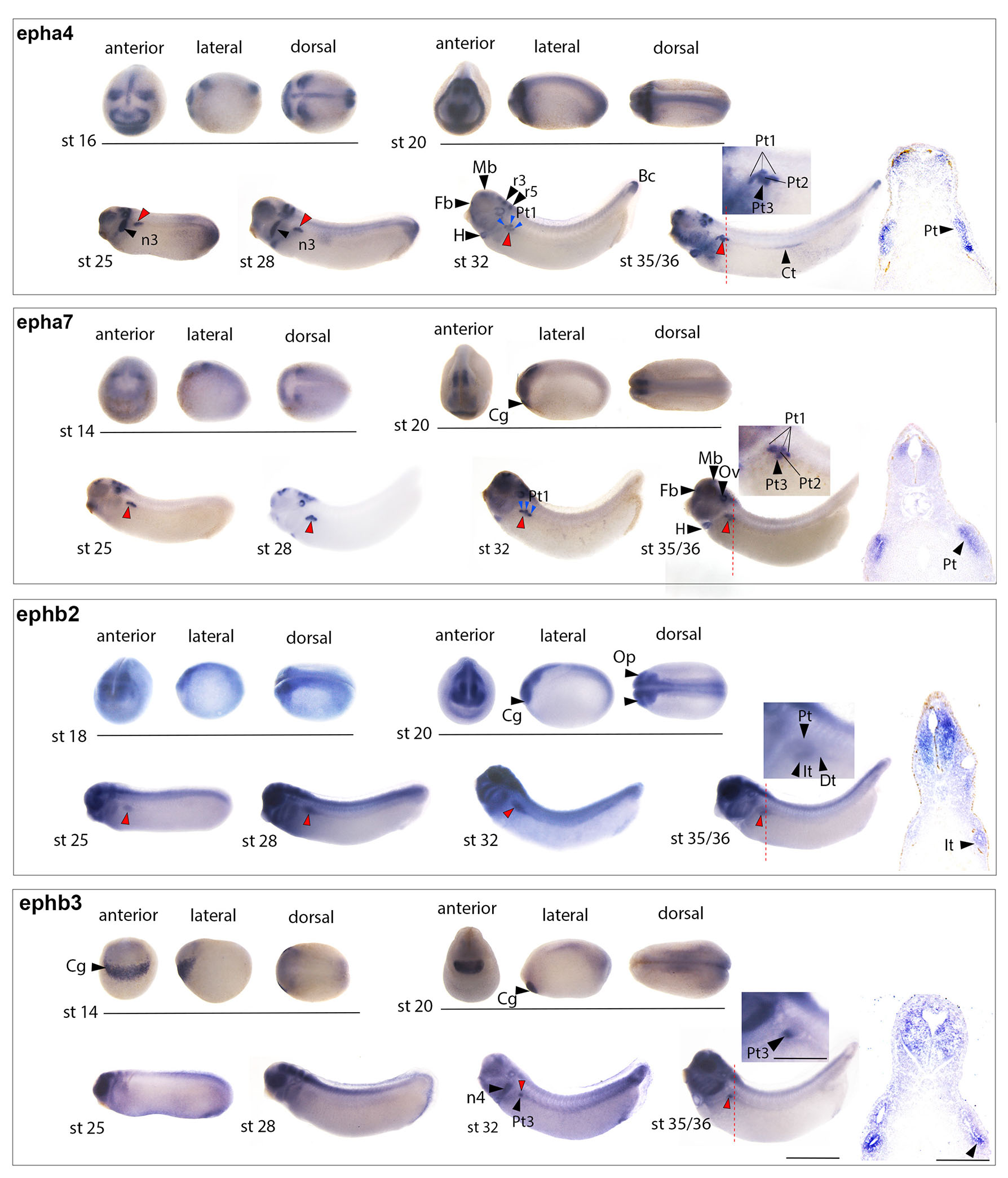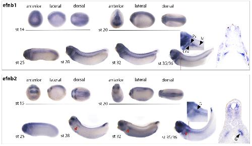 Supplemental Fig. 2. [efnb3] Expression of genes encoding ephrin-b ligands at stages of pronephric development from kidney field (neurula stages 14-18) to functional pronephros (early tadpole stage 35/36). Anterior, dorsal and lateral views are shown at neurula stages (st14-18 and 20). Only lateral views are shown for tailbud stages 25, 28 and 32. A lateral view with the enlarged pronephric region is shown at early tadpole stage 35/36. ....Efnb3 is not expressed in the developing pronephros. The red arrowheads indicate the pronephric anlage at stage 28 and the pronephros at stage 32 and 35/36. Scale bars: 1.7 mm for whole embryo, 0.5 mm for embryonic magnification and 280 μm for section.