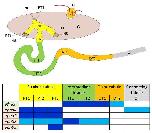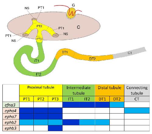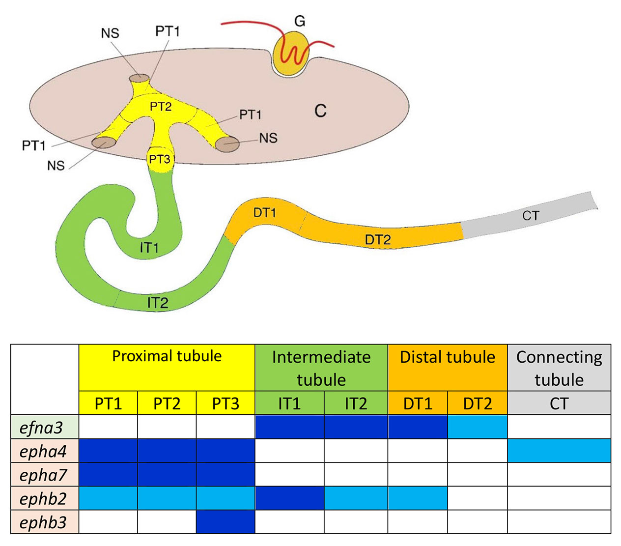 Schematic representation of the pronephros and table (inspired by Raciti el al., 2008); Ephrin ligands are outlined in green and Eph receptors in light orange. Dark blue: strong expression. Turquoise blue: middle expression. Efnb2 expression is detected in the glomus at stage 35/36 and not in the tubule and is therefore not included in the table.