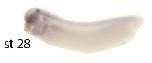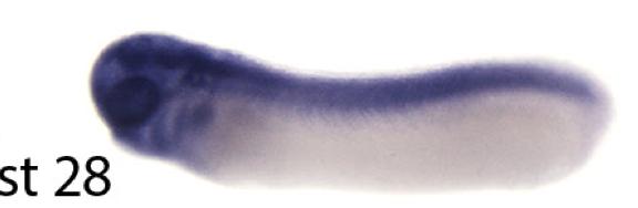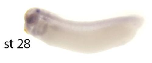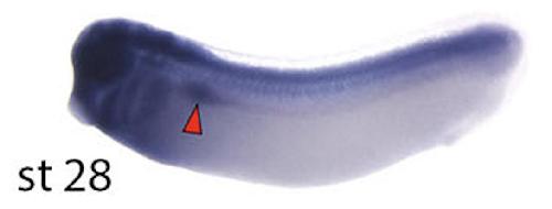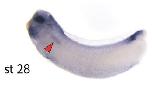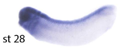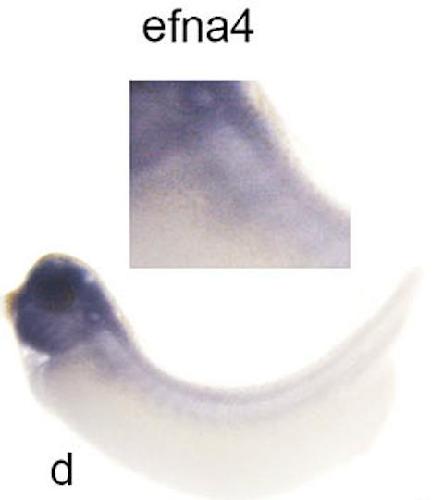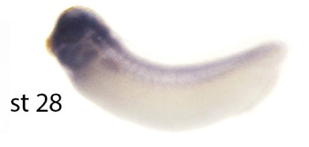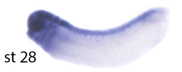 efna4 (ephrin A4) gene expression in X. laevis embryo, assayed whole-mount via in situ hybridization (WISH) at NF stage 28, lateral view anterior left, dorsal up.