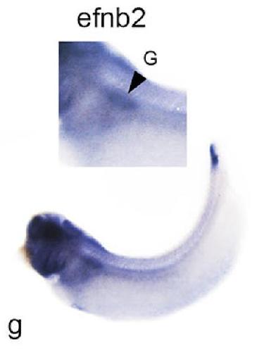 efnb2 (ephrin B2) gene expression in X. laevis embryo, assayed whole-mount via situ hybridization (WISH) at NF stage 32, lateral view anterior left, dorsal up.
