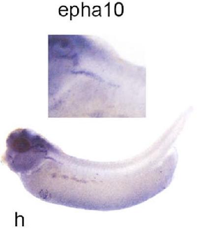 epha10 (EPH receptor A10) gene expression in X. laevis embryo, assayed whole-mount via situ hybridization (WISH) at NF stage 25, lateral view anterior left, dorsal up.